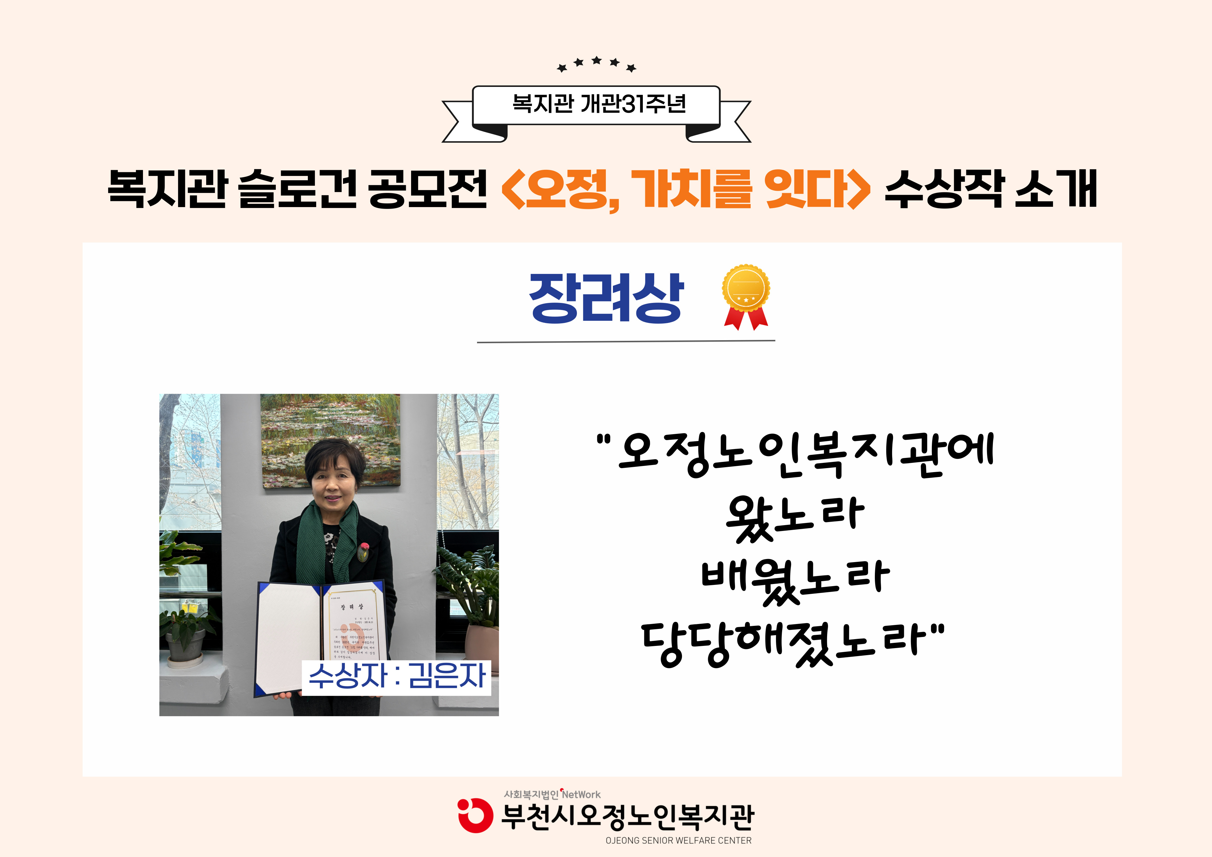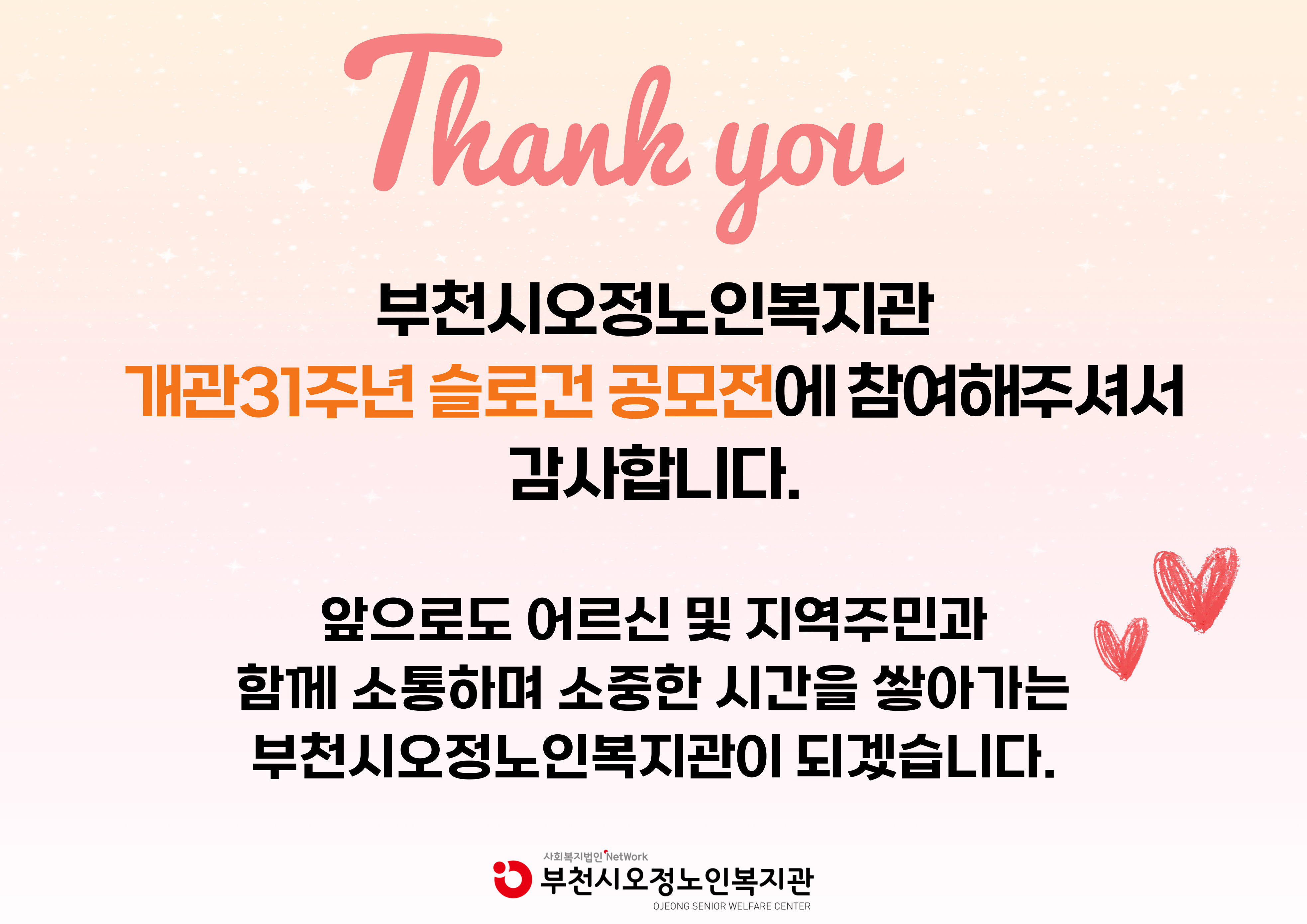 복지관 개관 31주년을 기념하여 진행된 「오정, 가치를 잇다」 슬로건 공모전에 총 38편의 작품이 접수되었고, 내부심사-시민투표를 진행하여 슬로건을 선정하였습니다.