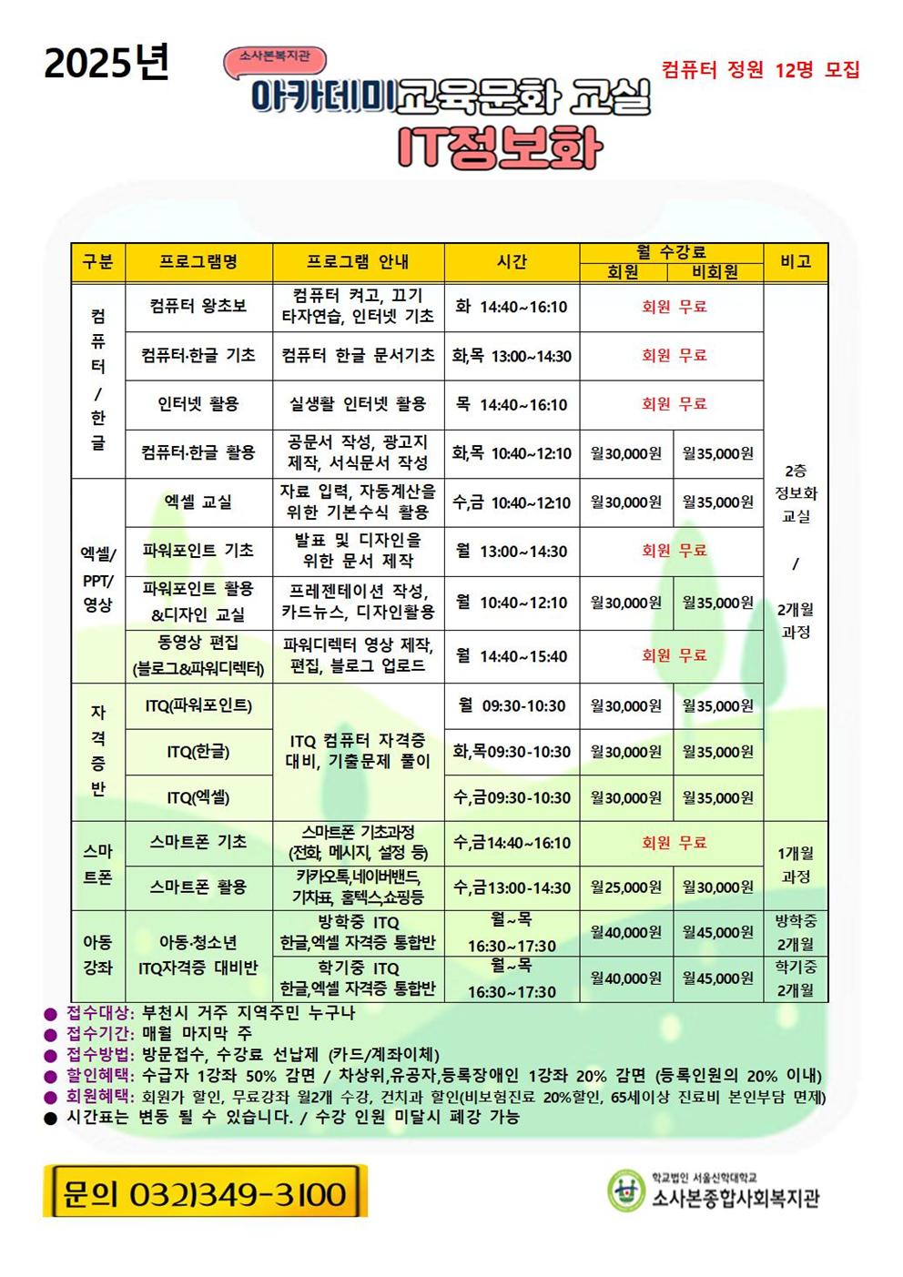 부천시에서 진행하는 정보화 기초강좌는 복지관 회원님들에게 무료로 진행됩니다.(선착순 접수)