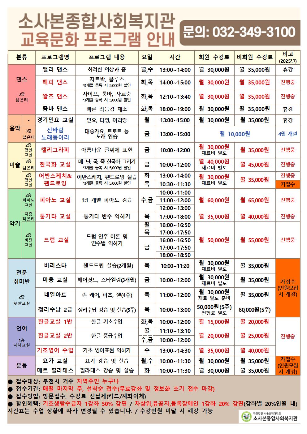 소사본종합사회복지관에서는 다양하고 재미있는 교육문화강좌를 운영하고 있습니다~
