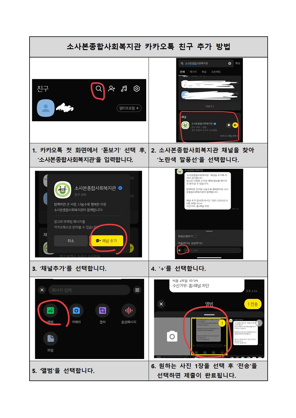 2) '소사본종합사회복지관' 카카오톡 친구 추가 후 사진 전송 *사진 전송이 어려우신 분은 1층 사무실로 문의주세요~
