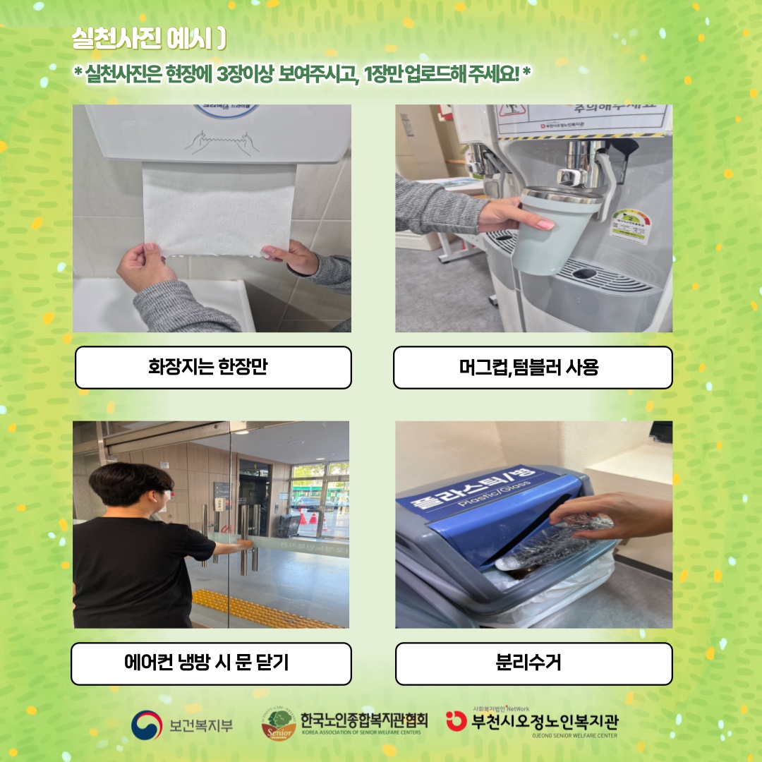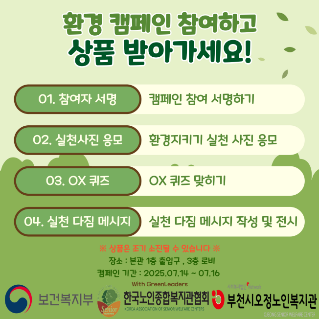 쾌적한 복지관 이용과 생활속 환경보호 활동을 실천하자는 내용으로 아래와 같이 캠페인이 진행되오니 많은 관심과 참여 바랍니다.