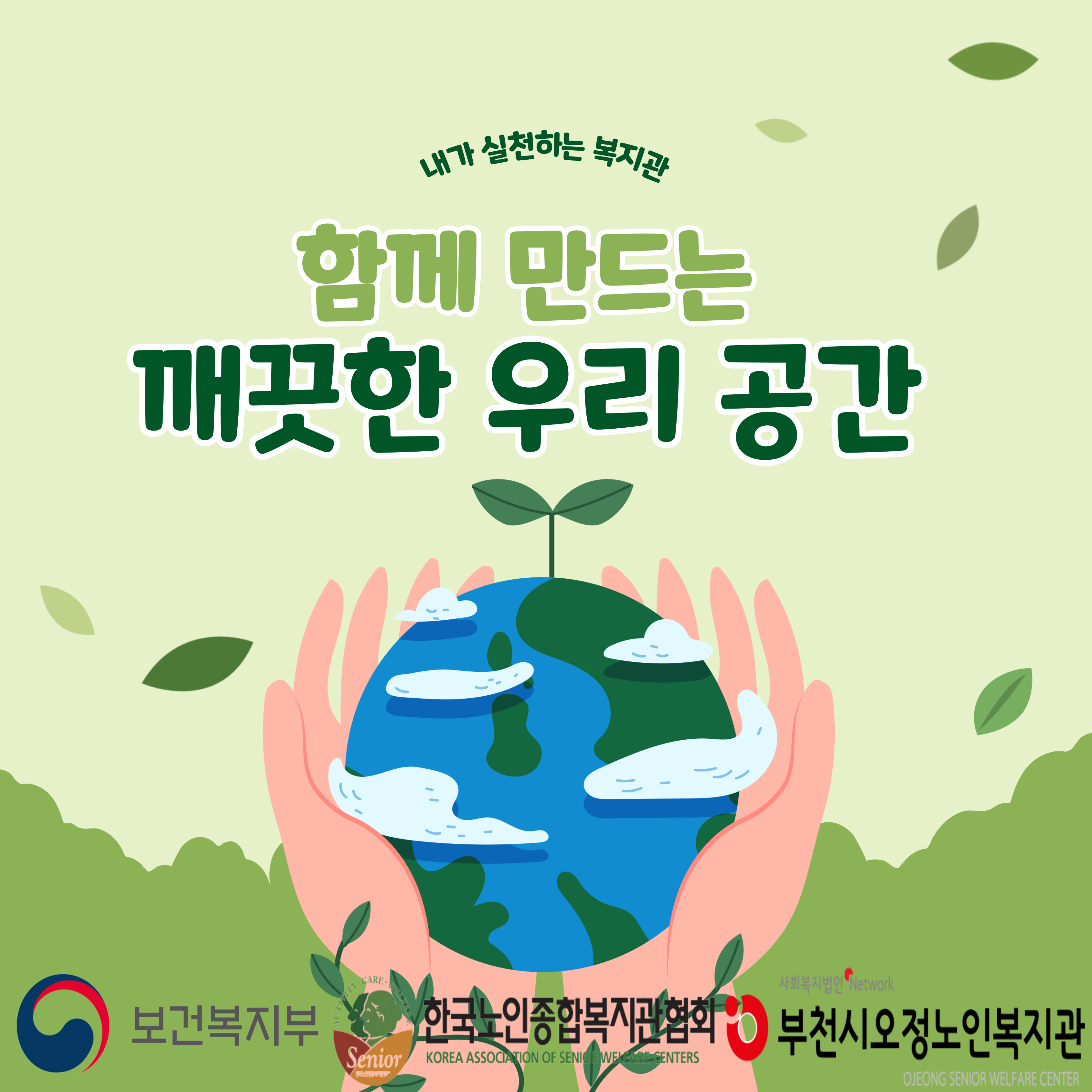 복지관에서는 그린리더스 노인자원봉사단과 함께 '함께 만드는 깨끗한 우리공간' 환경캠페인을 진행합니다.