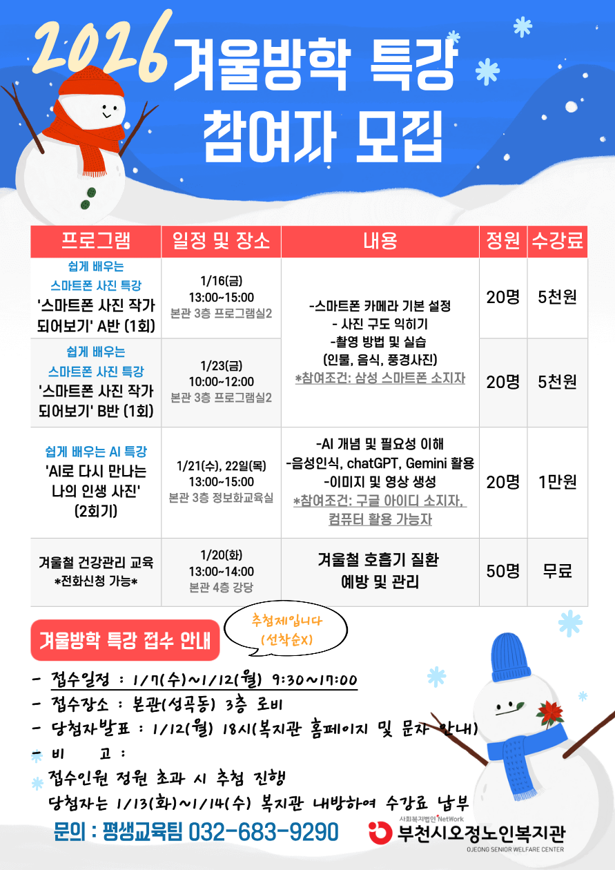 2026년 새롭게 시작된 한 해, 즐겁게 배울 수 있는 겨울방학 특강을 진행하오니, 복지관 이용 어르신의 많은 참여바랍니다.