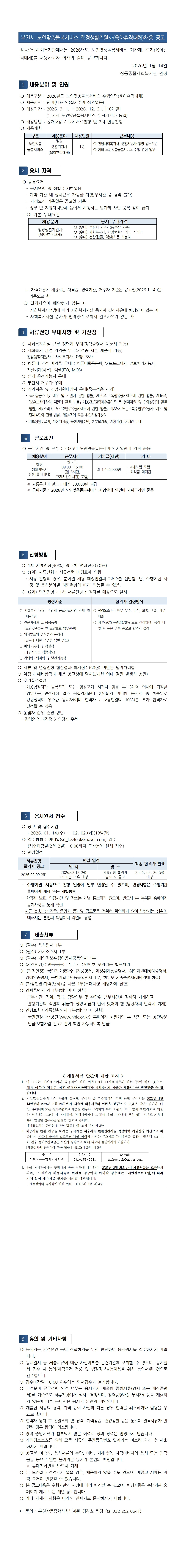 2026년 부천시 노인맞춤돌봄서비스 행정생활지원사(육아휴직대체)채용 공고