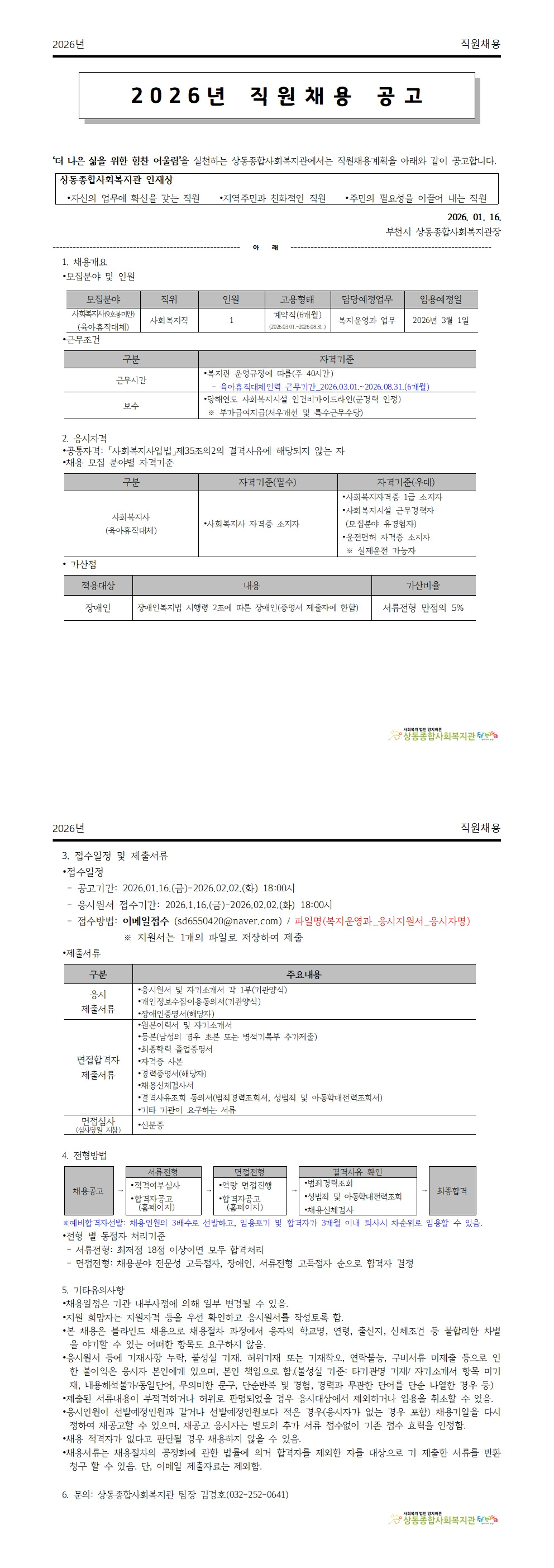 [채용공고] 2026년 상동종합사회복지관 복지운영과 사회복지사 계약직[육아휴직대체 6개월] 직원채용 공고