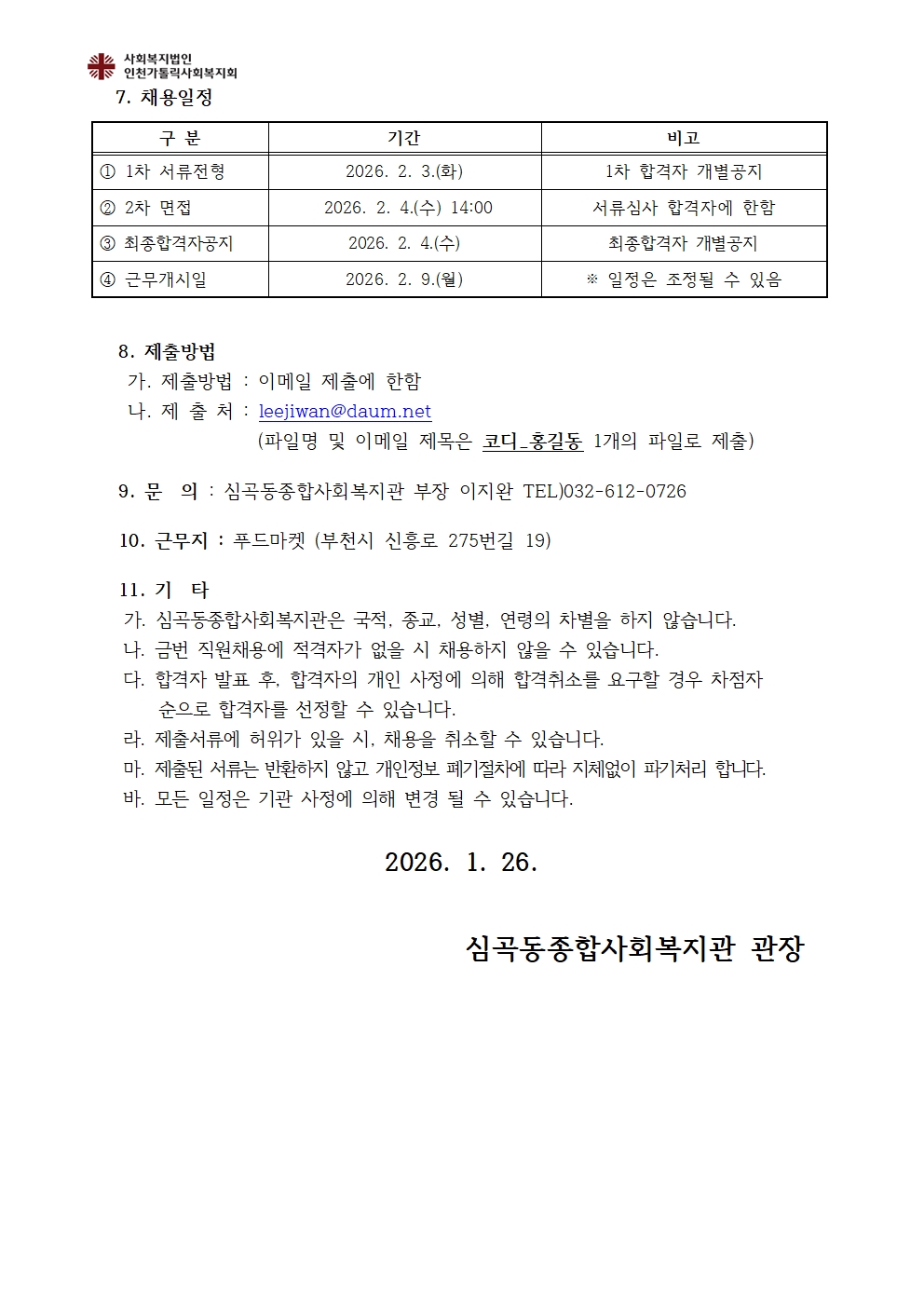 (긴급)심곡동종합사회복지관 직원채용(푸드마켓 코디네이터 1명)_재공고