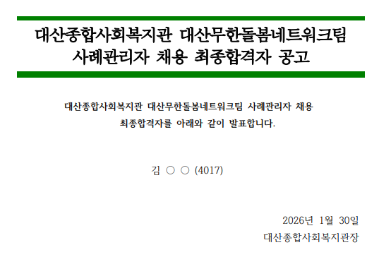 대산종합사회복지관 대산무한돌봄네트워크팀 사례관리자 채용 최종합격자 공고