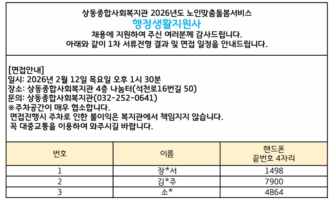 [상동채용결과] 2026년 노인맞춤돌봄서비스 행정생활지원사(육아휴직대체) 서류전형 발표