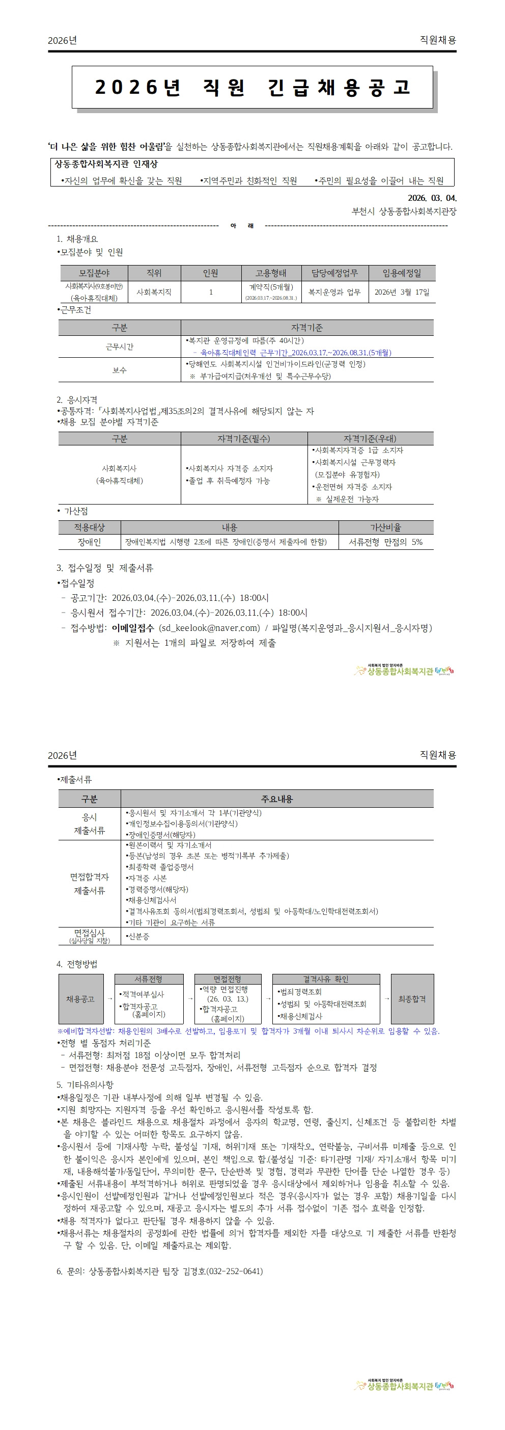 [긴급채용] 상동종합사회복지관 사회복지사(육아휴직대체) 채용 공고