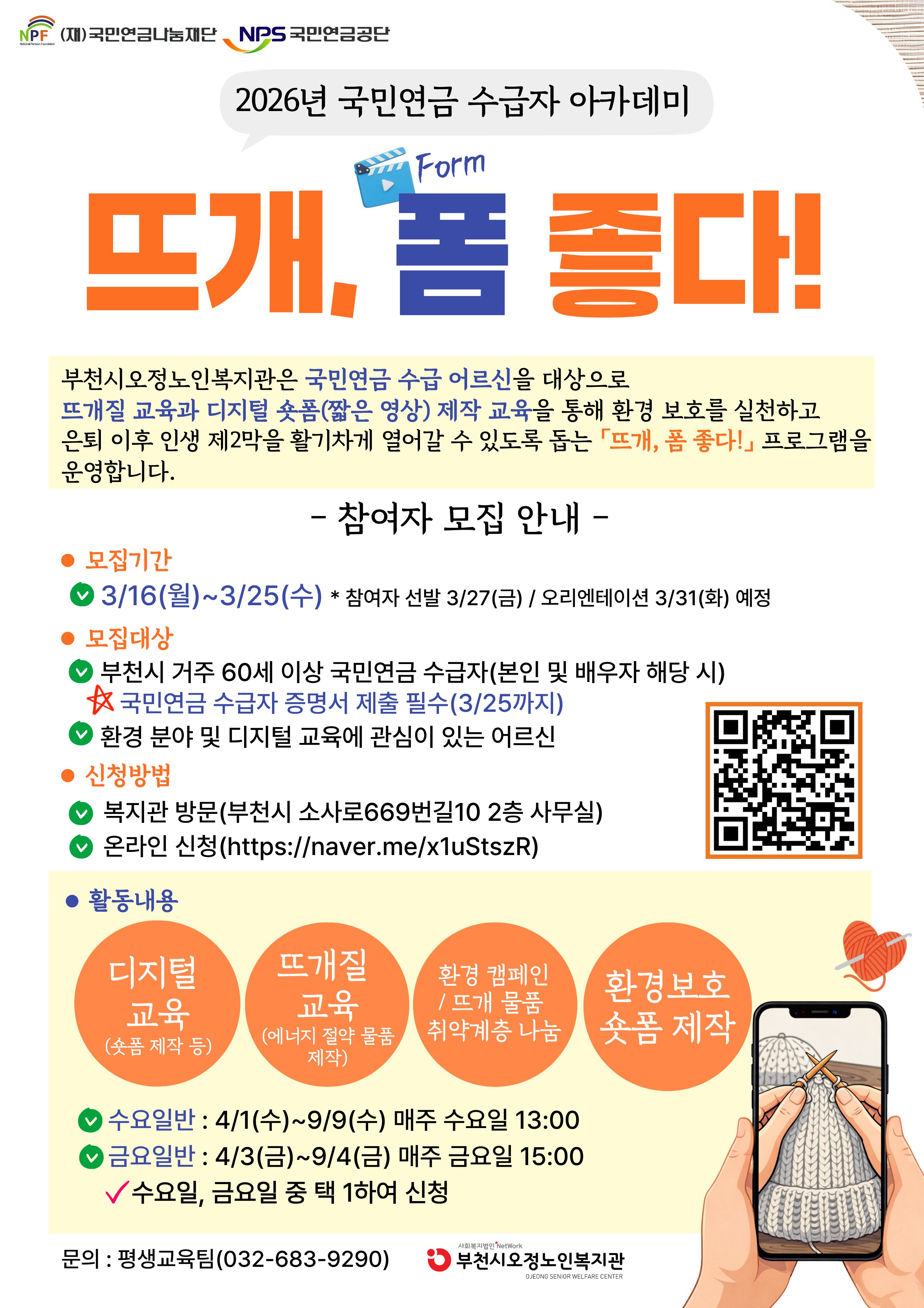 부천시오정노인복지관은 국민연금 수급 어르신을 대상으로 뜨개질 교육과 디지털 숏폼(짧은 영상) 제작 교육을 통해 환경 보호를 실천하고 어르신이 은퇴 이후 인생 제2막을 활기차게 열어갈 수 있도록 돕는 「뜨개, 폼 좋다!」 프로그램을 운영합니다.