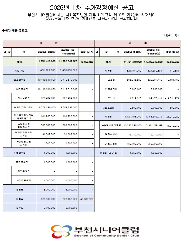 2026년 부천시니어클럽 1차 추가경정 예산 공고