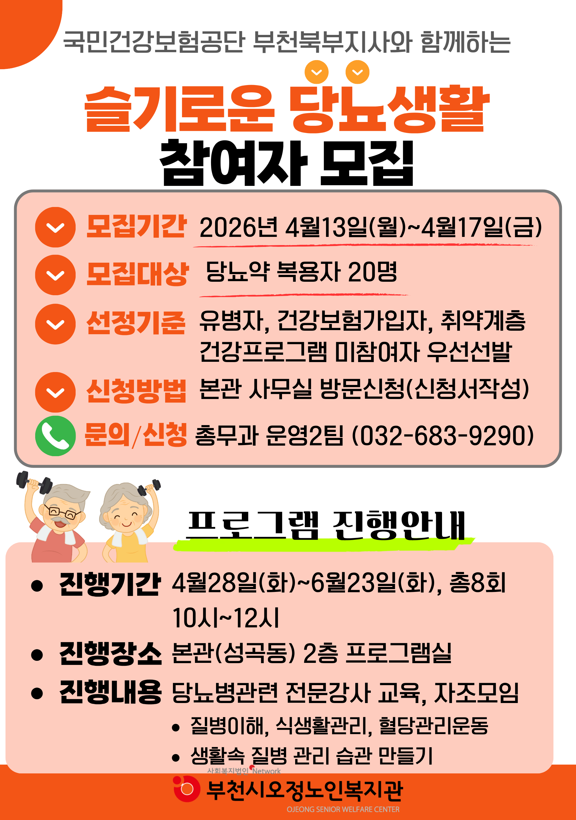 부천시오정노인복지관에서는 국민건강보험공단 부천북부지사와 함께하는 만성질환교육 프로그램 "슬기로운 당뇨생활" 참여자를 아래와 같이 모집하오니 많은 신청 바랍니다.