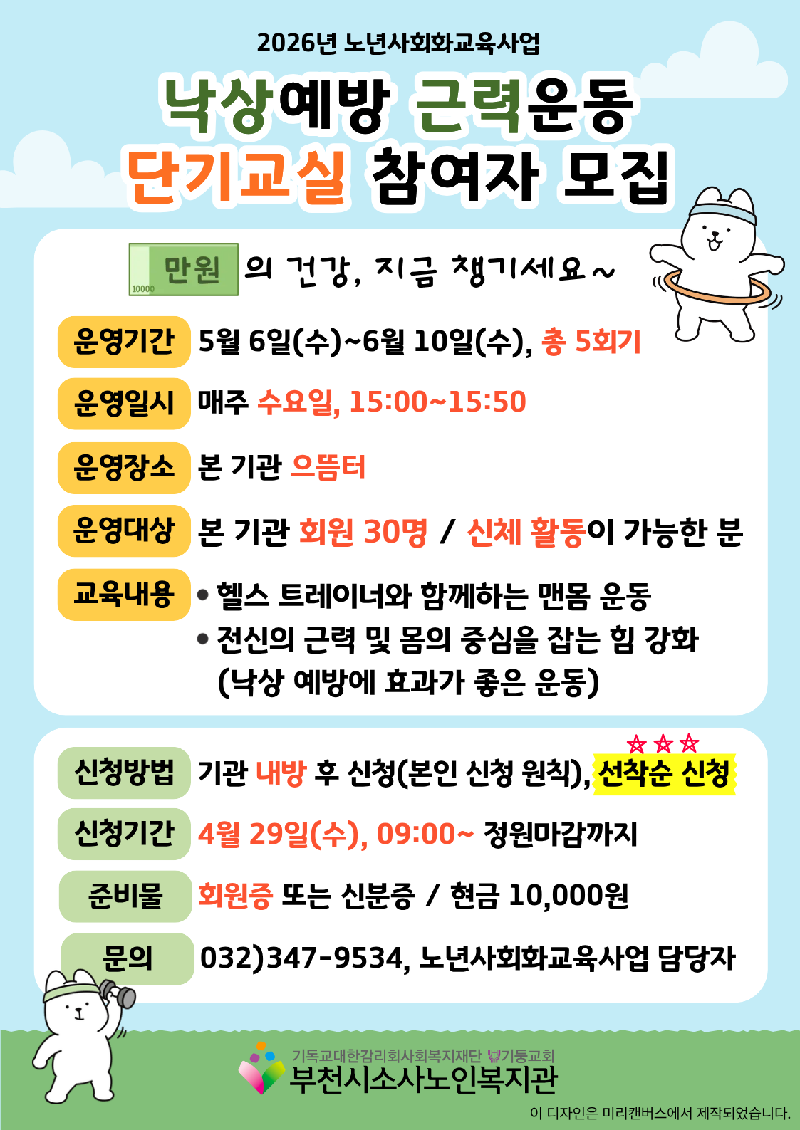 [노년사회화교육사업] 「낙상예방·근력운동 단기교실」 참여자 모집