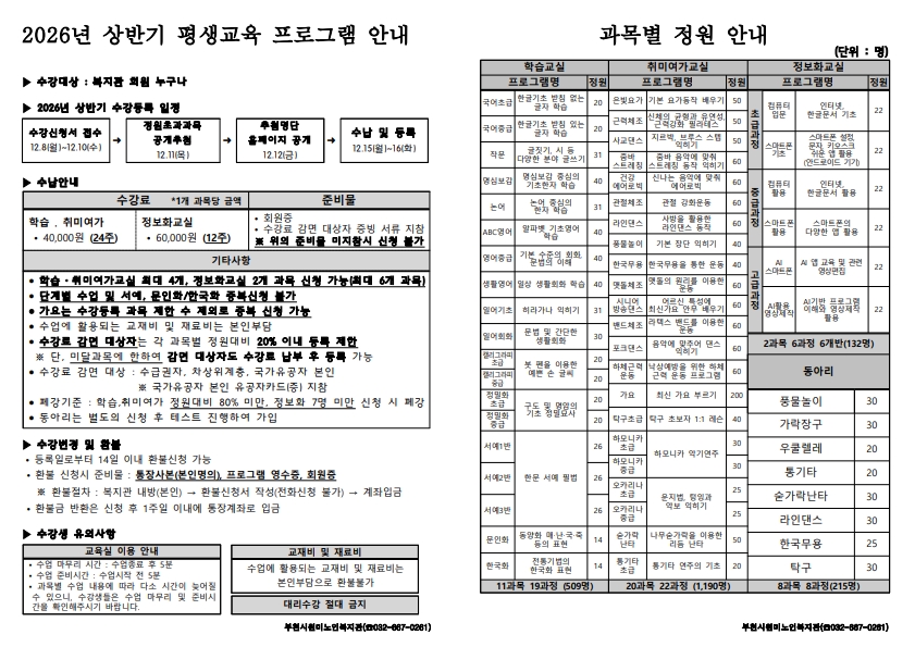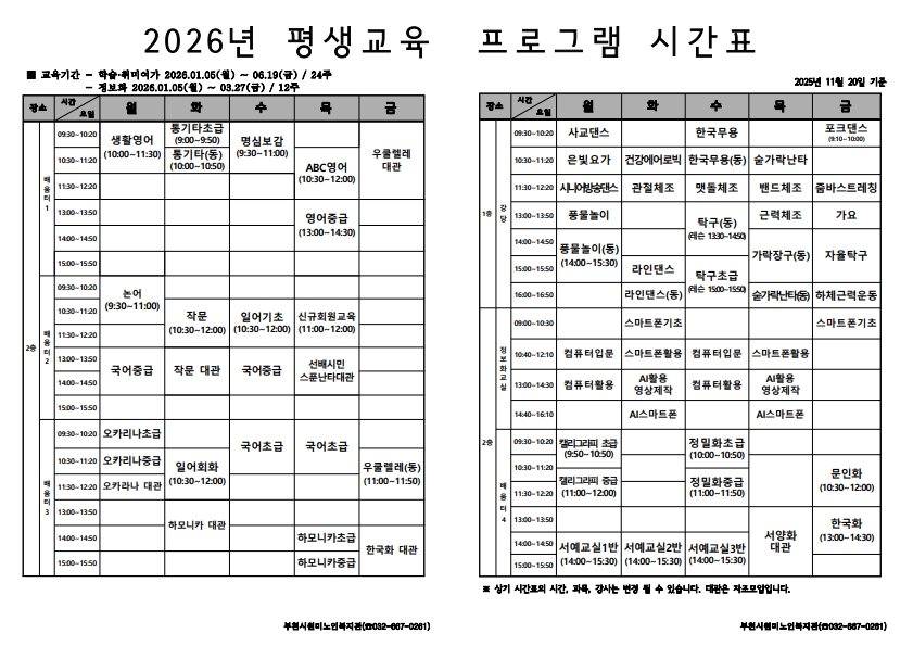 원미노인복지관 2026년 평생교육 상반기 시간표