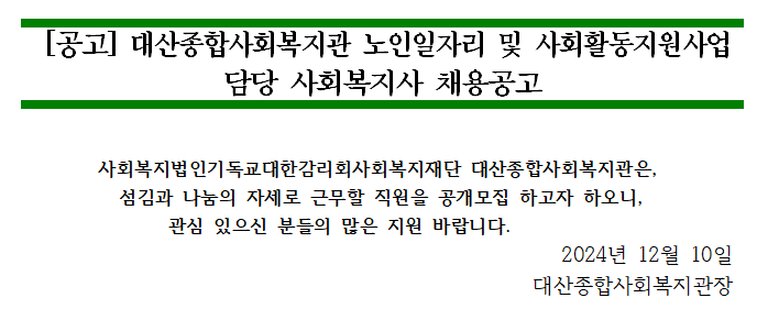 대산종합사회복지관 노인일자리 및 사회활동지원사업 담당 사회복지사 채용 공고