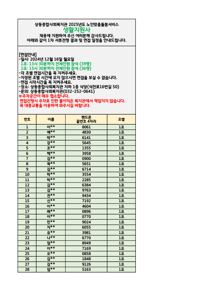 [상동채용결과] 2025년 노인맞춤돌봄서비스 생활지원사 1차 서류전형 합격자 발표