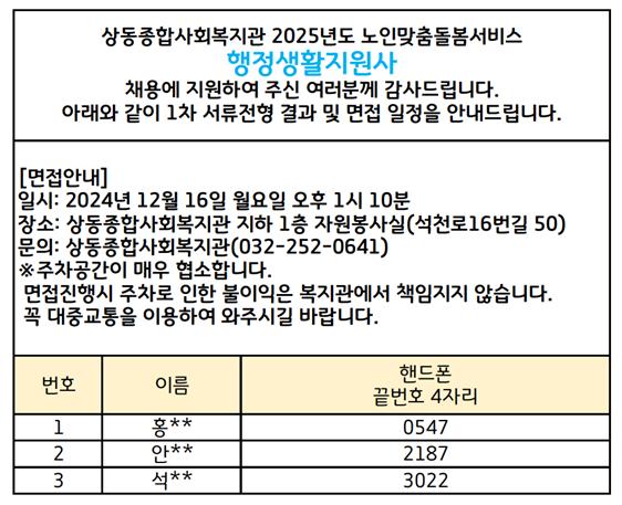 [상동채용결과] 2025년 노인맞춤돌봄서비스 행정생활지원사 1차 서류전형 합격자 발표