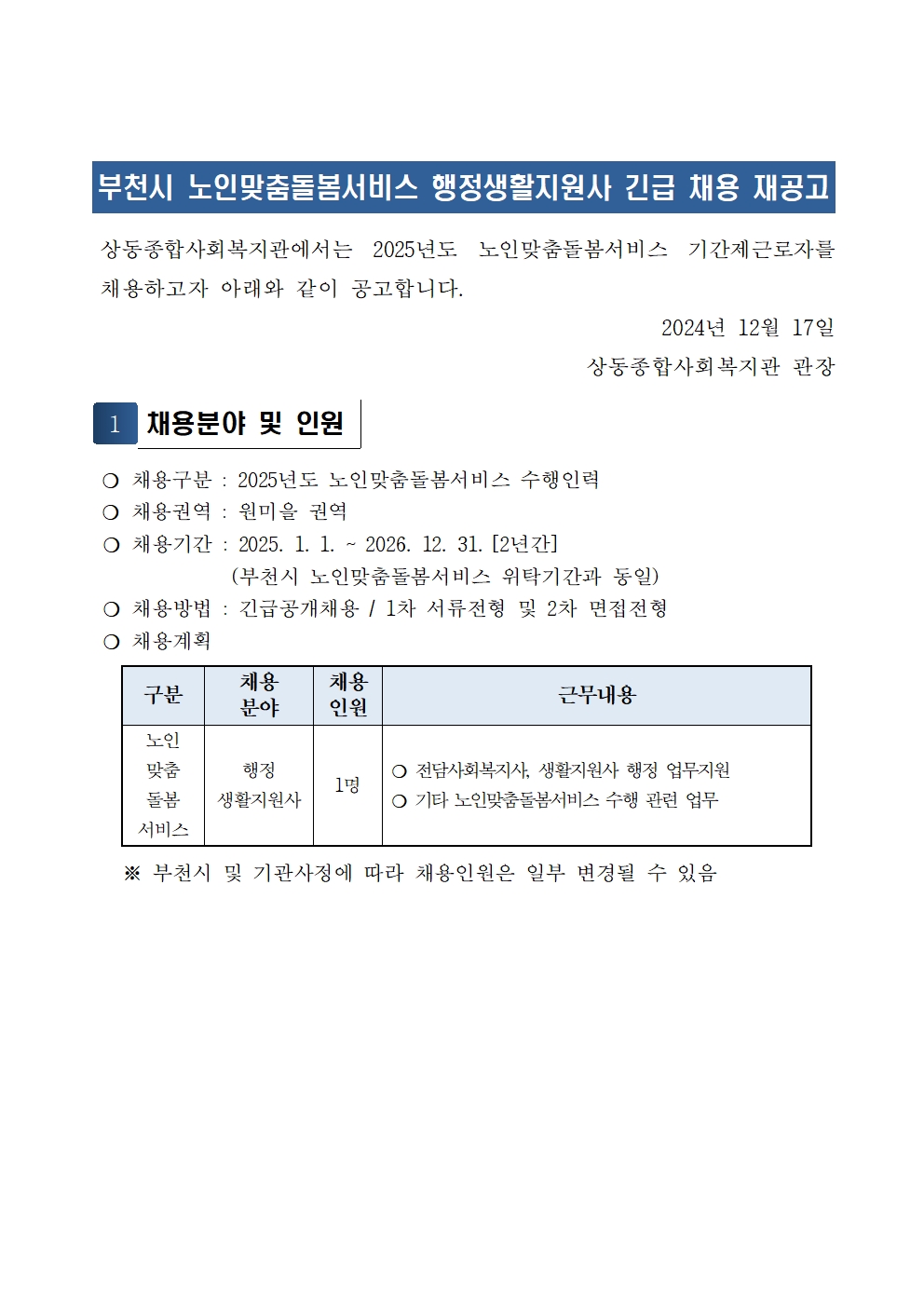 [긴급채용] 2025년도 노인맞춤돌봄서비스 행정생활지원사 긴급 채용 재공고