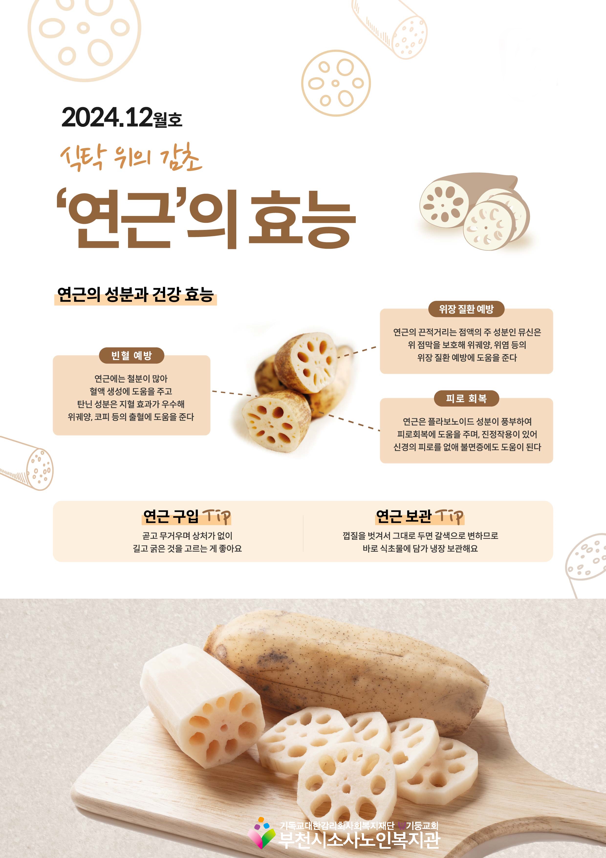 12월의 '영양쏙쏙정보'는 식탁 위의 감초라 불리우는 연근의 성분과 건강 효능에 대한 정보입니다.