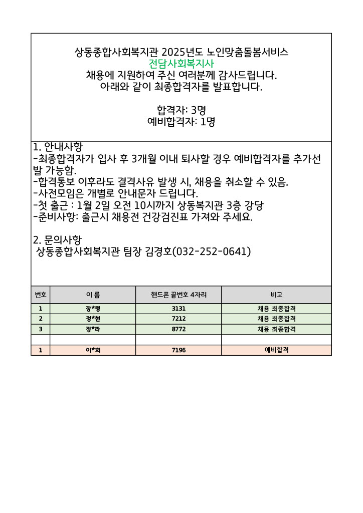 [상동채용결과발표] 2025년도 노인맞춤돌봄서비스 전담사회복지사 최종합격 공고