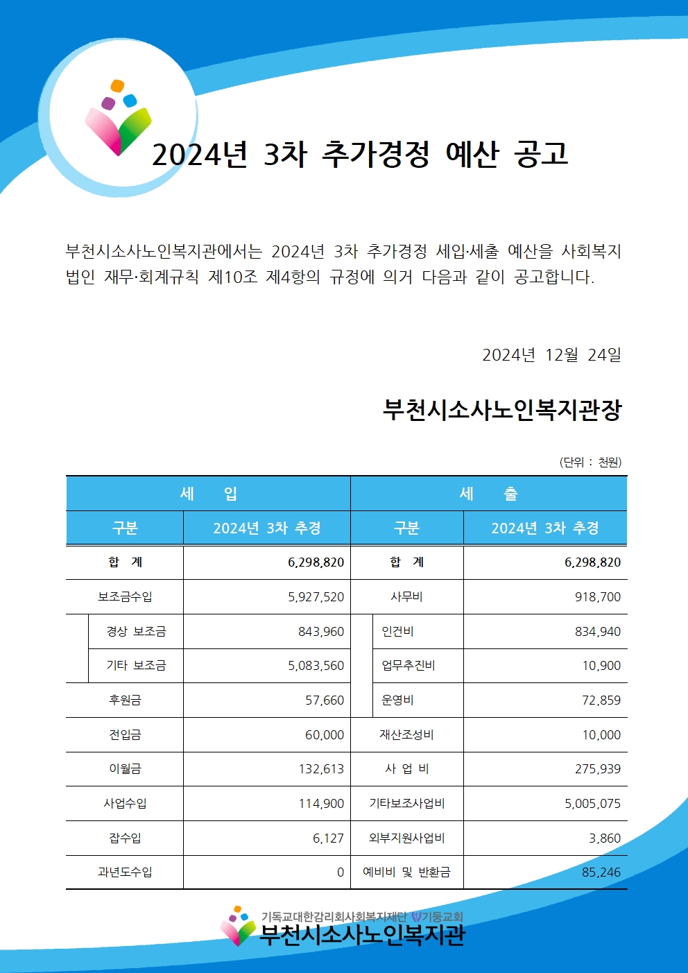 [부천시소사노인복지관] 2024년 3차 추가경정 예산보고