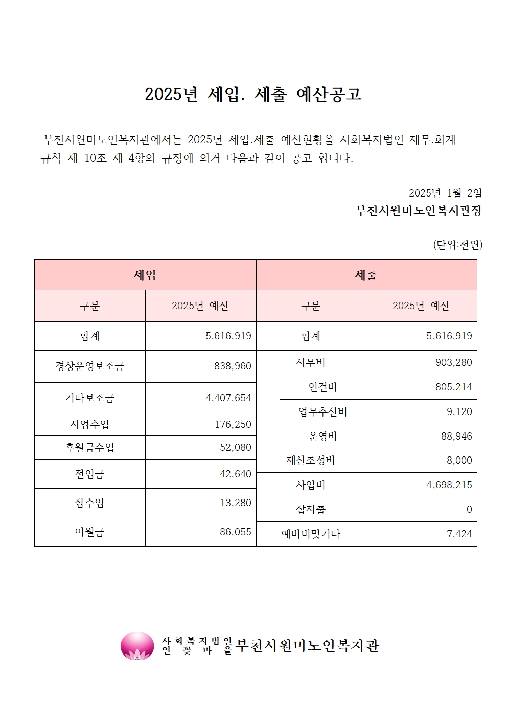 부천시원미노인복지관 2025년 세입 세출 예산공고