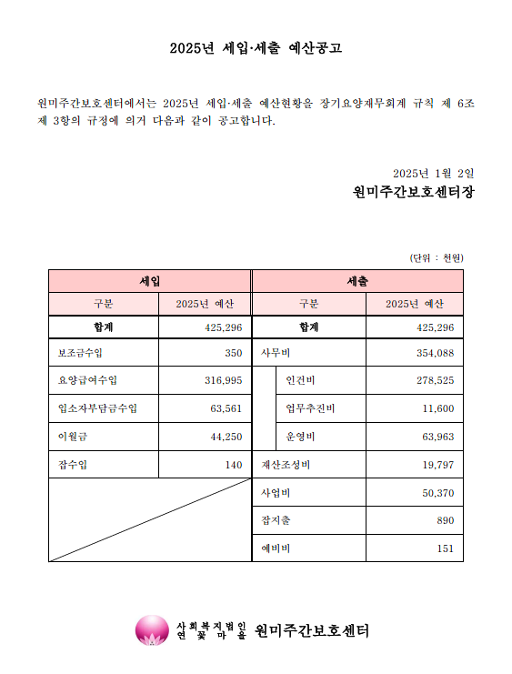 원미주간보호센터 2025년 세입,세출 예산공고