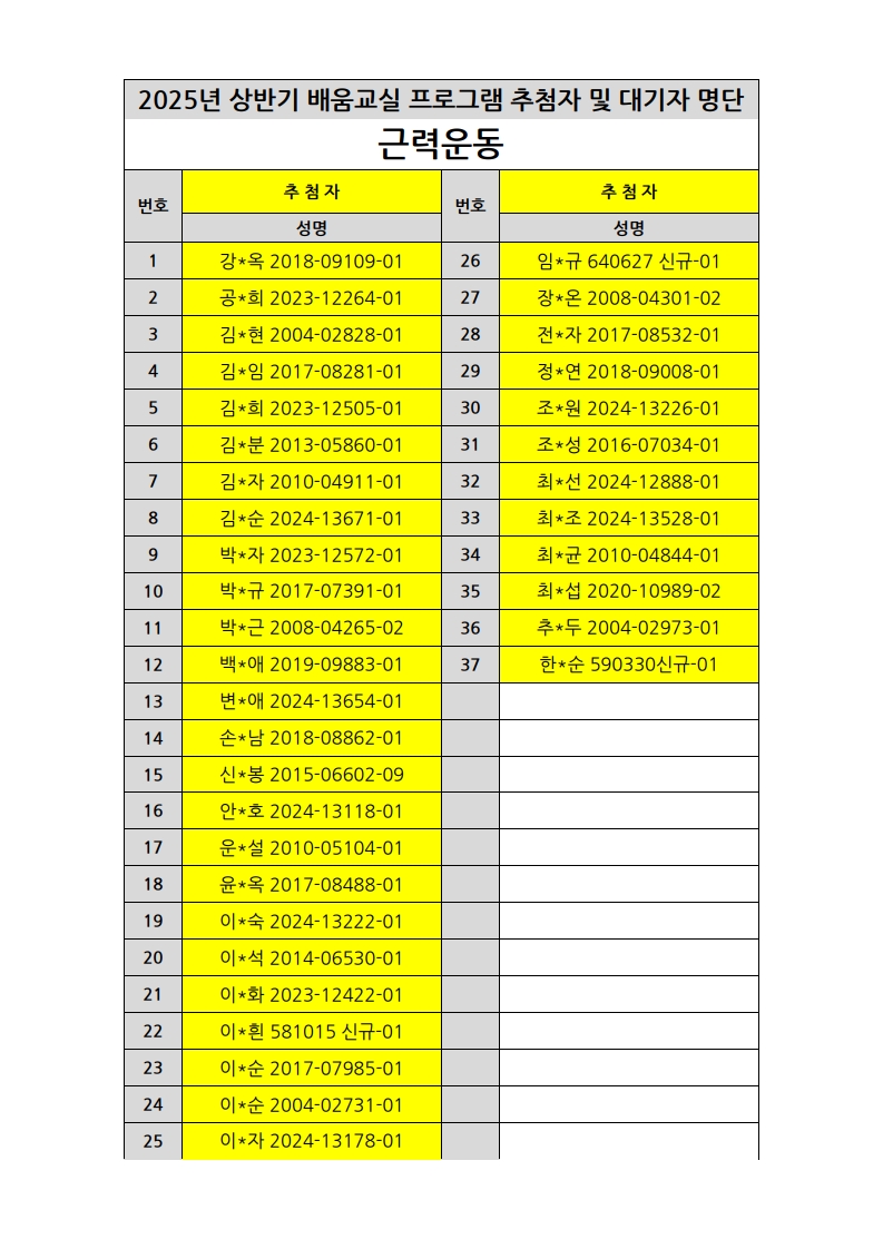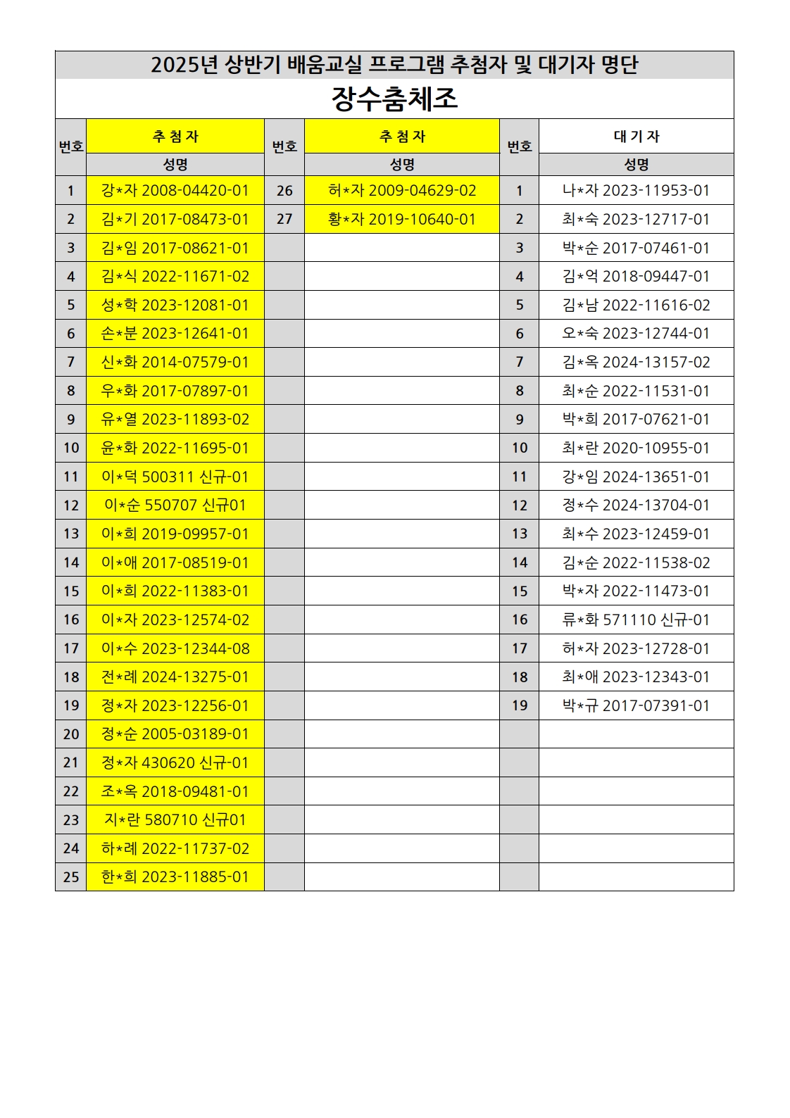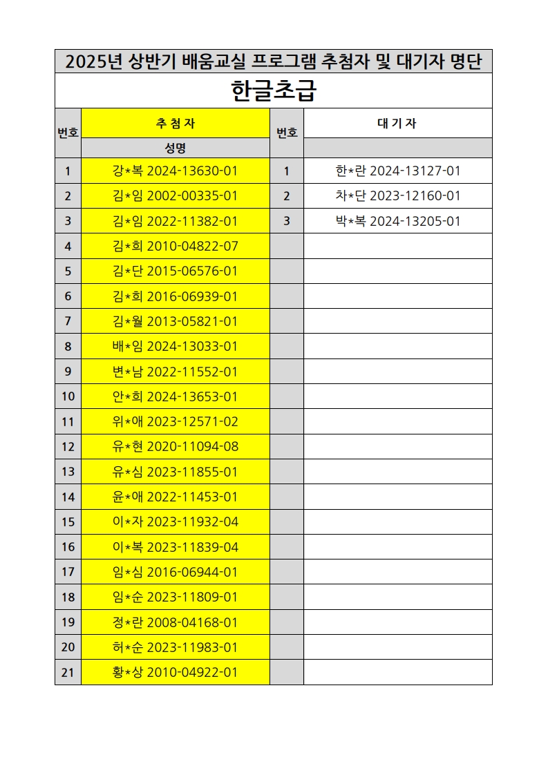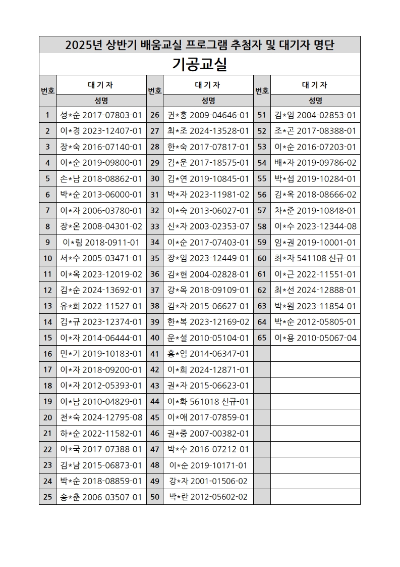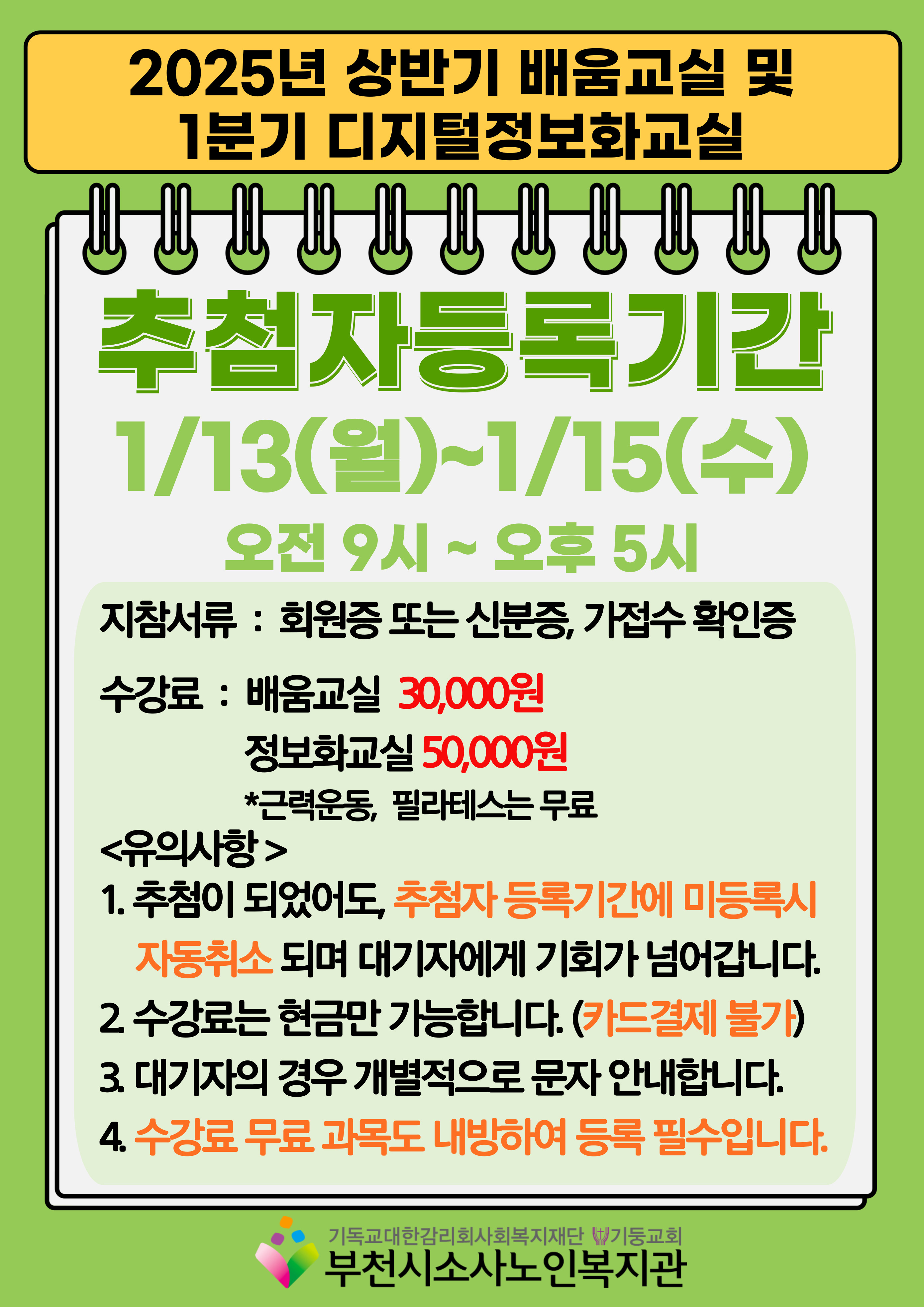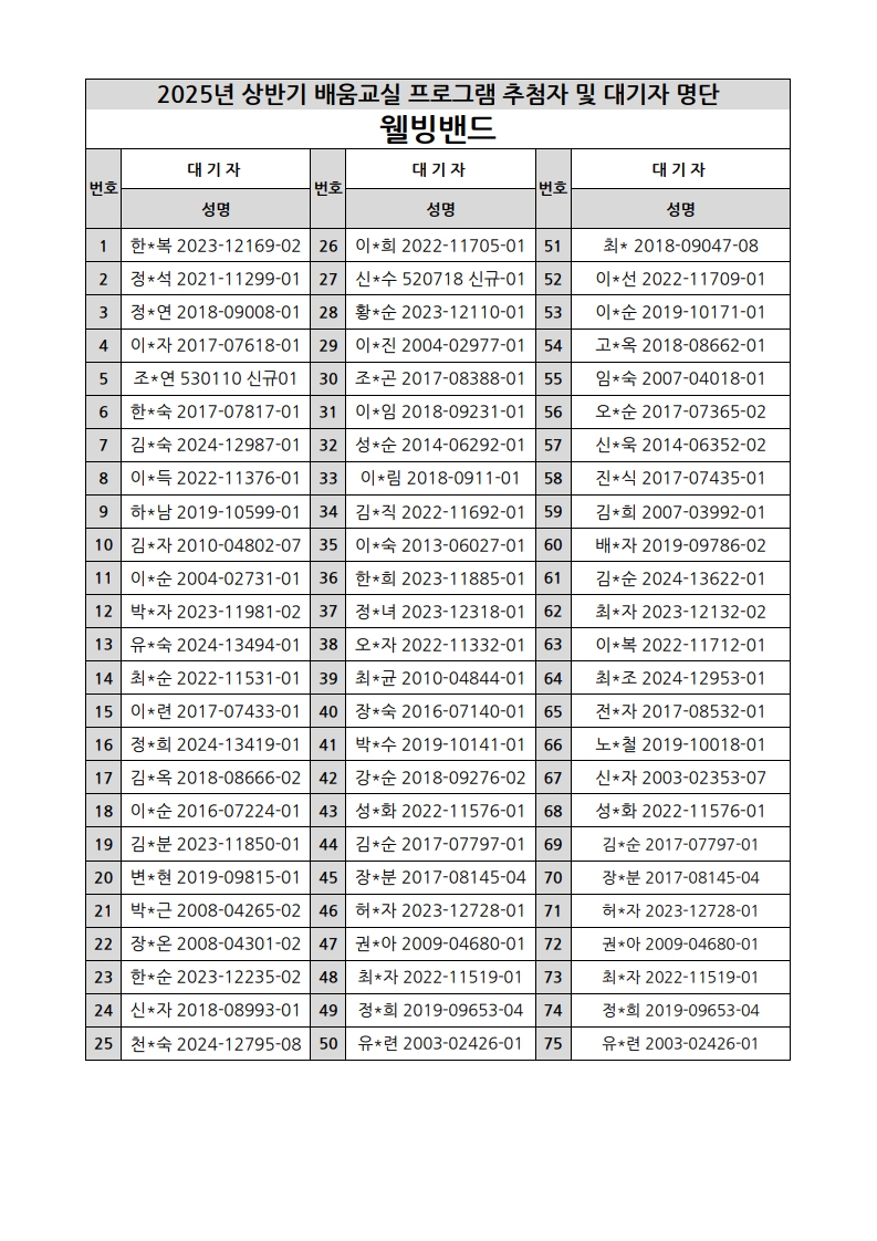 부천시소사노인복지관 2025년 상반기 배움교실 & 1분기 디지털정보화교실 추첨자 및 대기자 명단