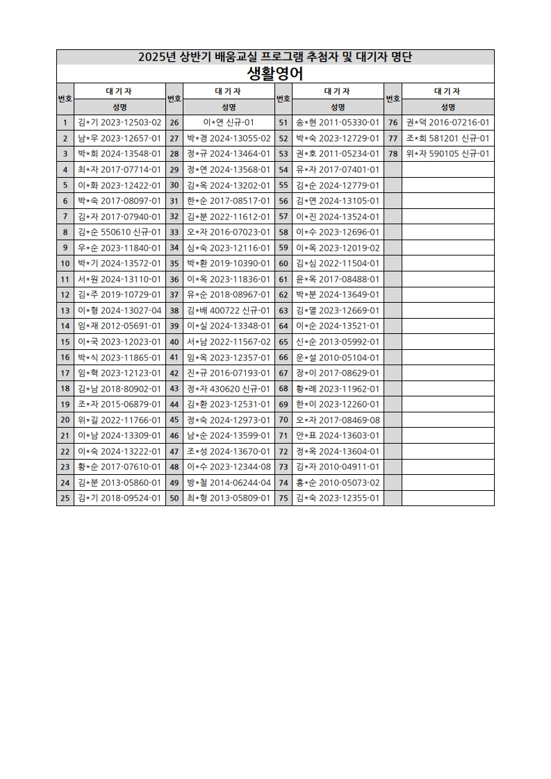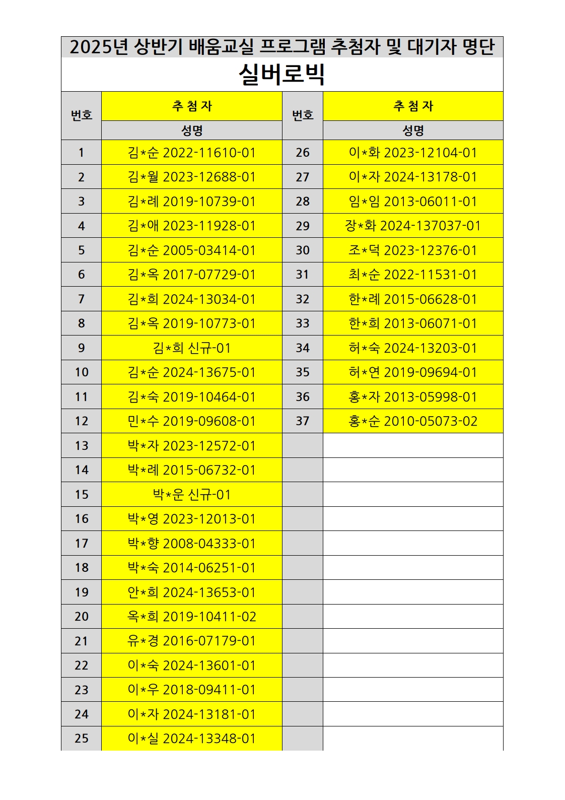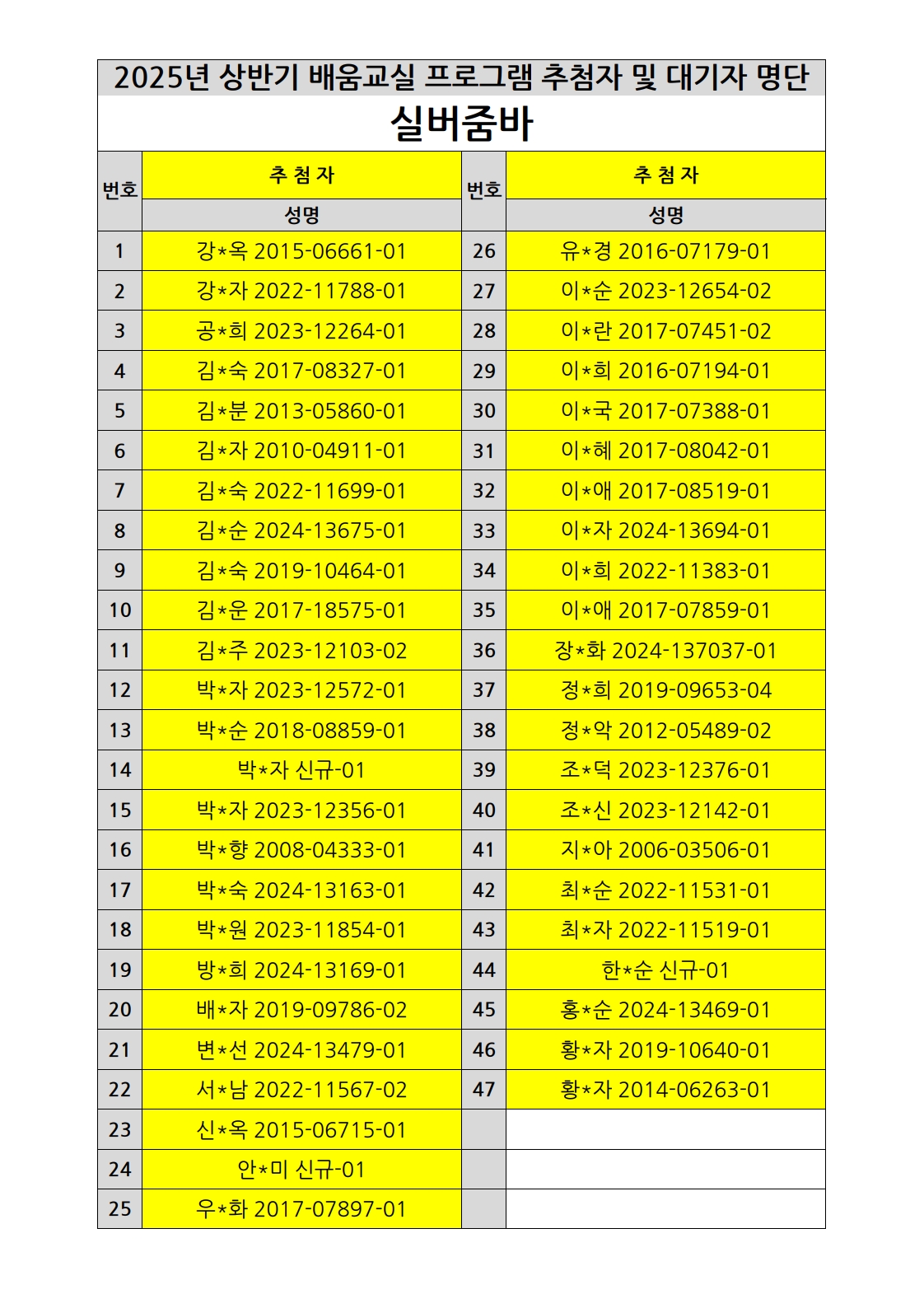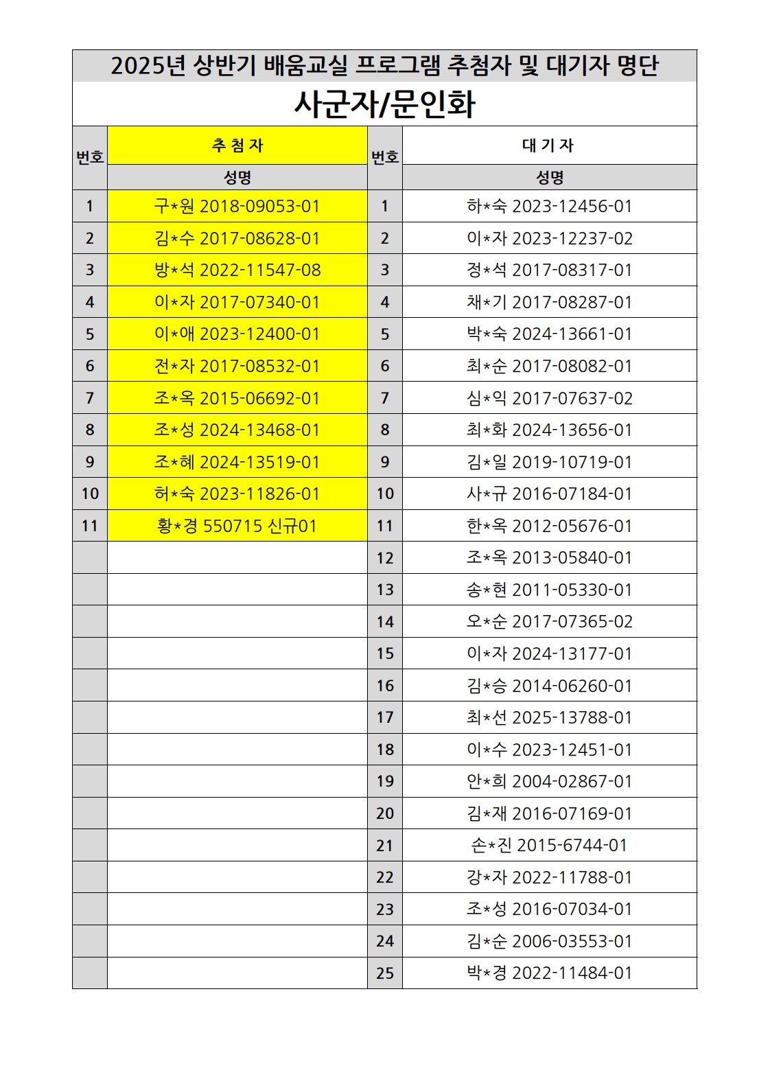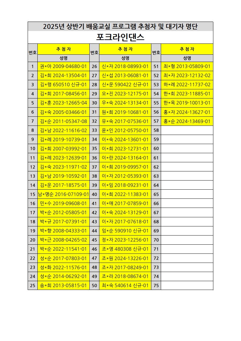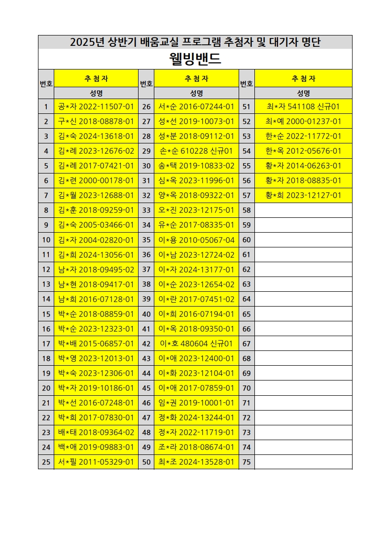 부천시소사노인복지관 2025년 상반기 배움교실 & 1분기 디지털정보화교실 추첨자 및 대기자 명단