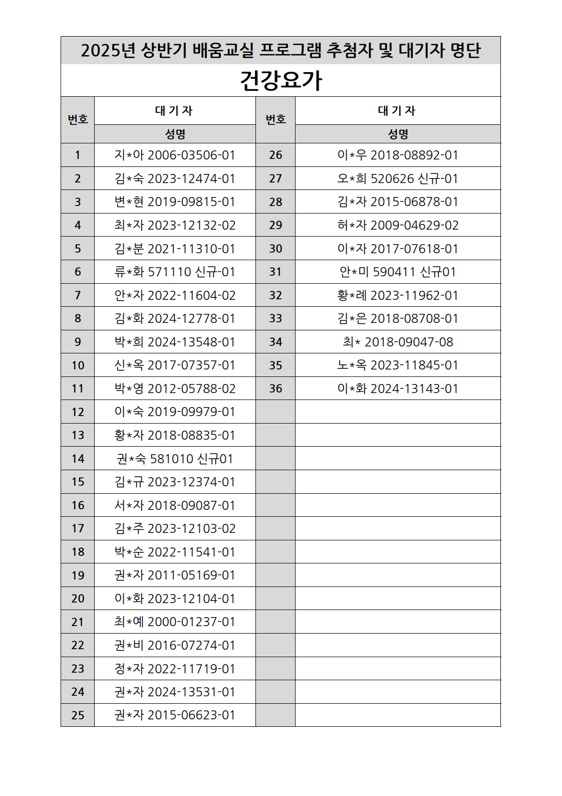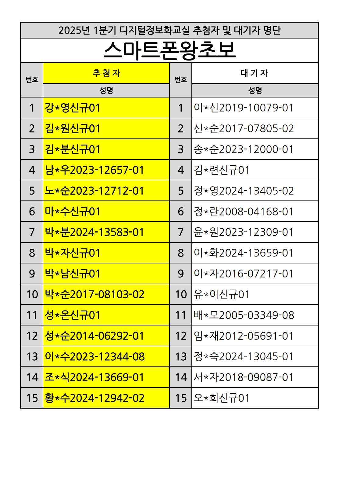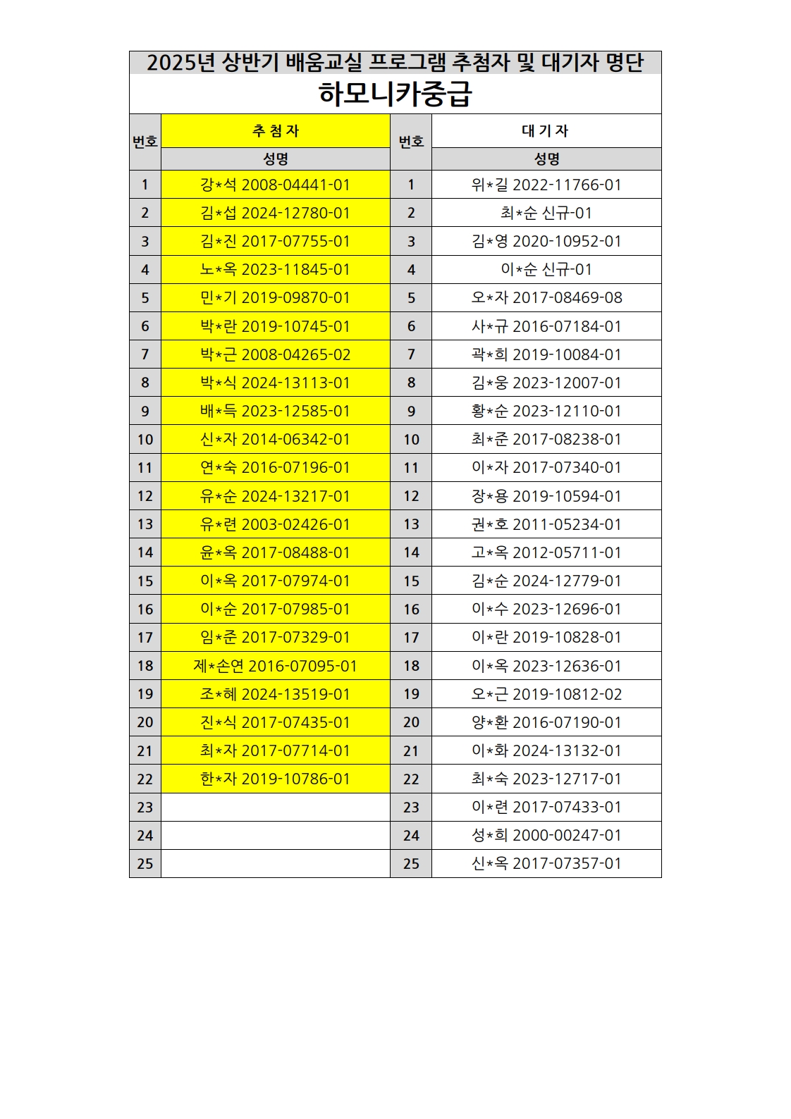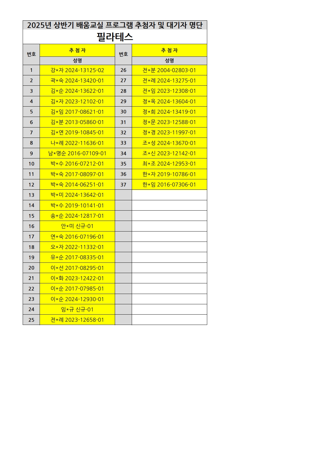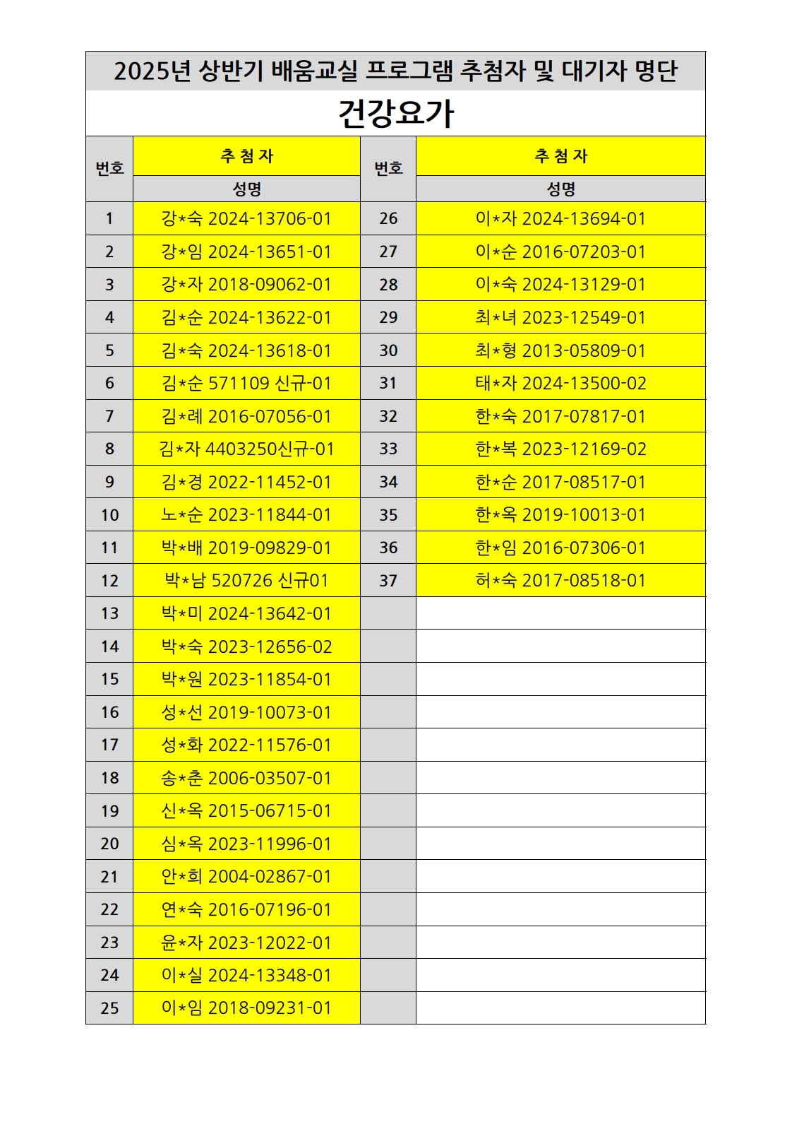 부천시소사노인복지관 2025년 상반기 배움교실 & 1분기 디지털정보화교실 추첨자 및 대기자 명단