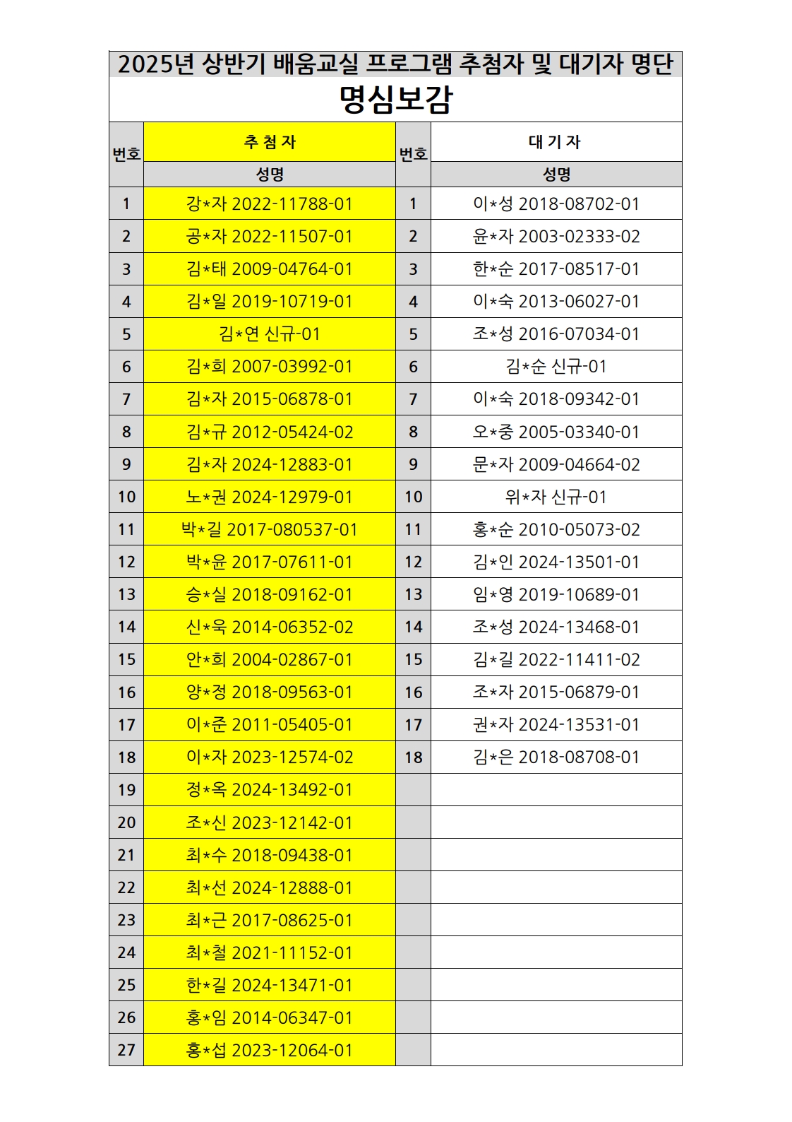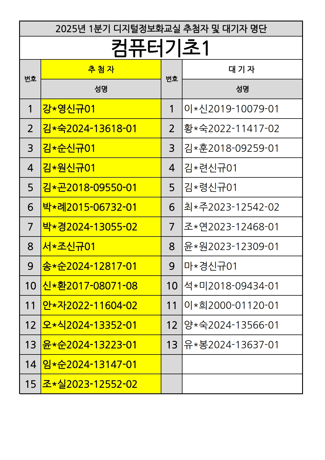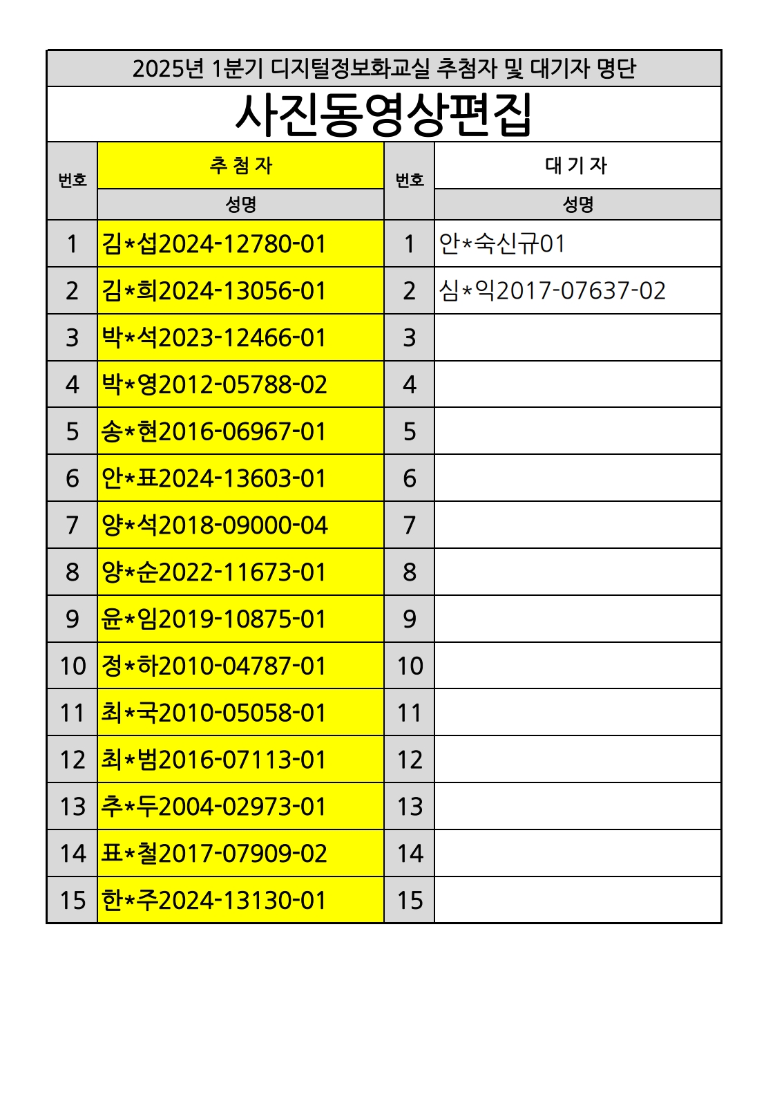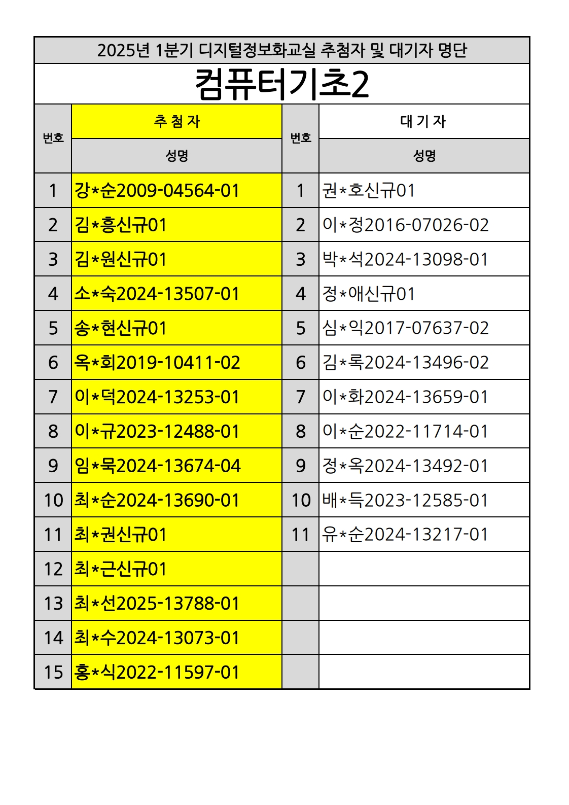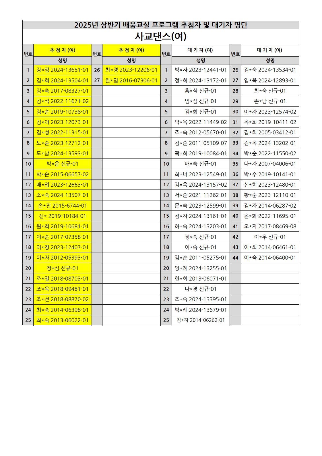 부천시소사노인복지관 2025년 상반기 배움교실 & 1분기 디지털정보화교실 추첨자 및 대기자 명단
