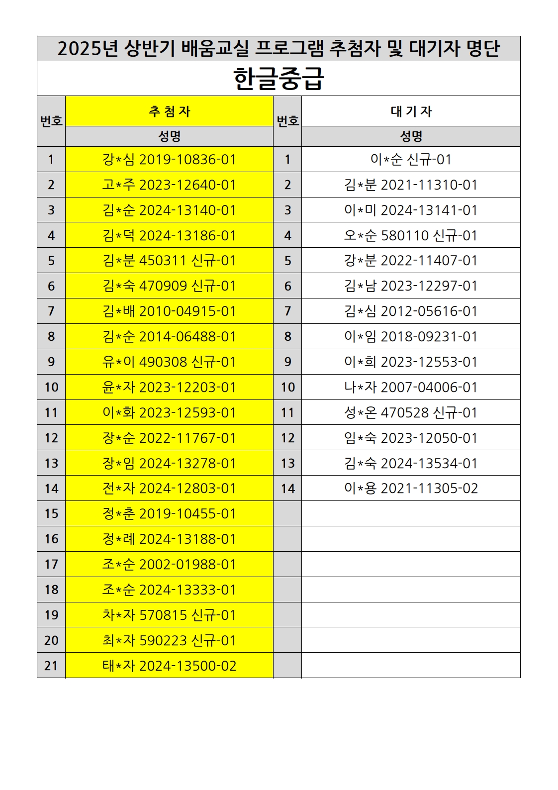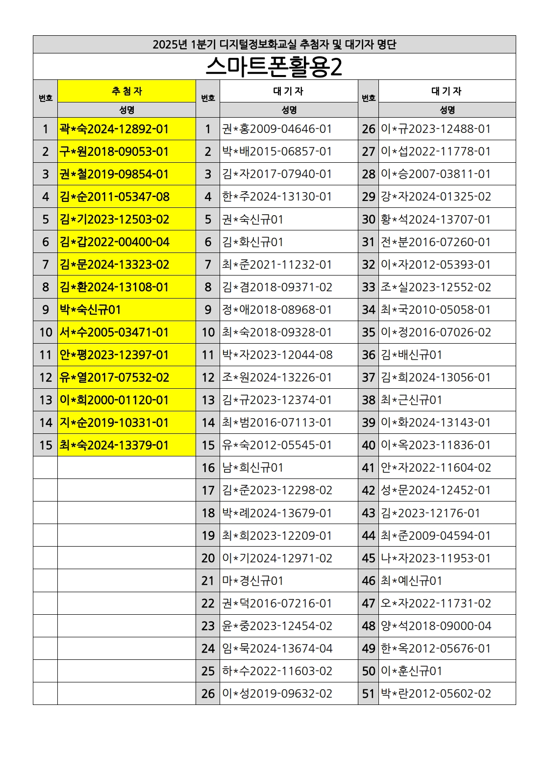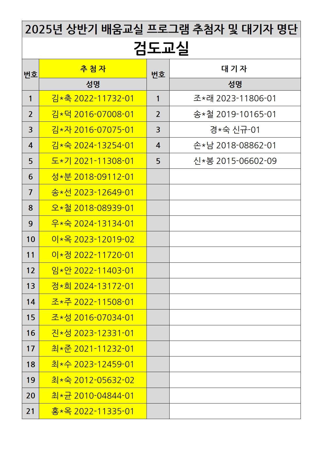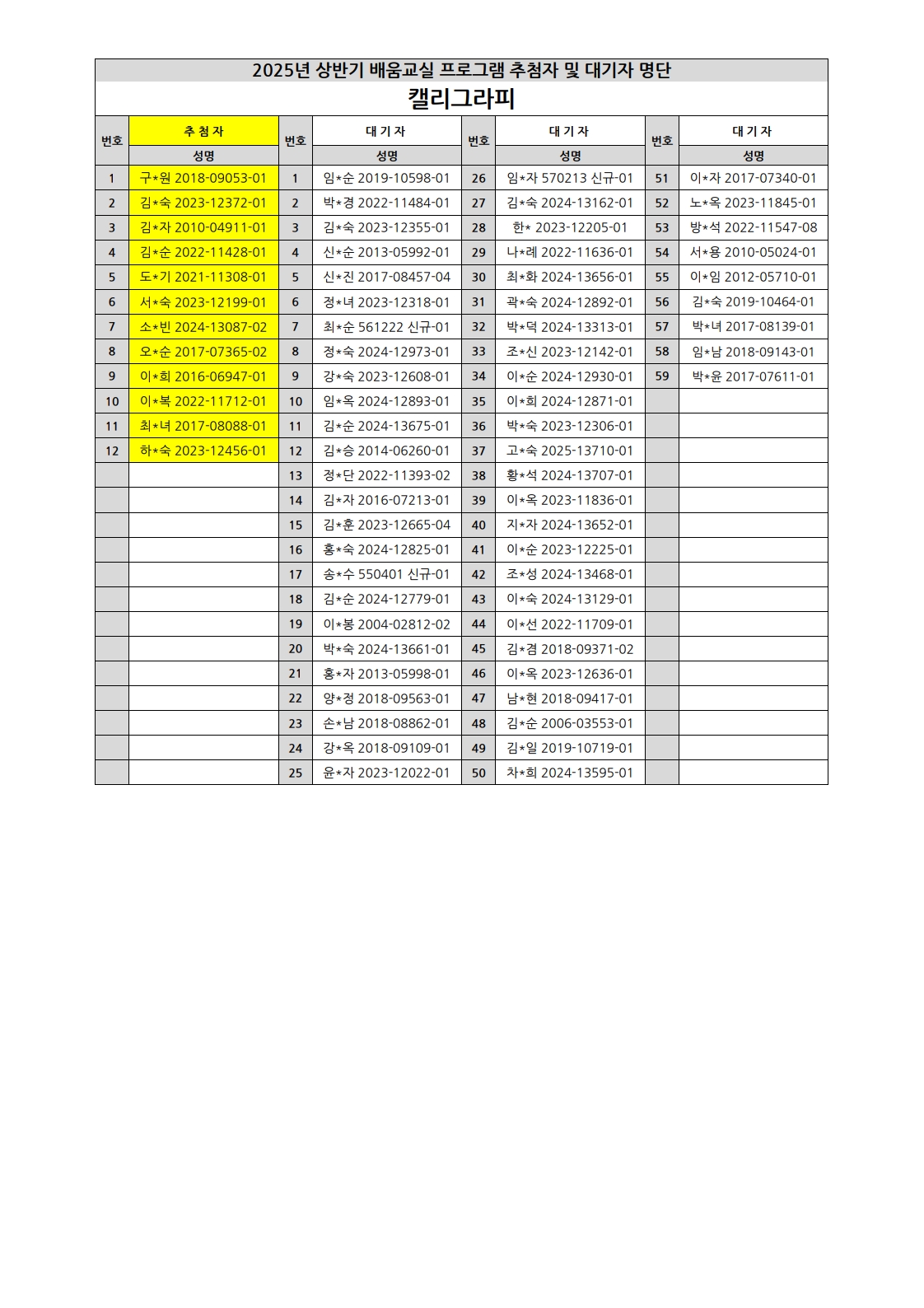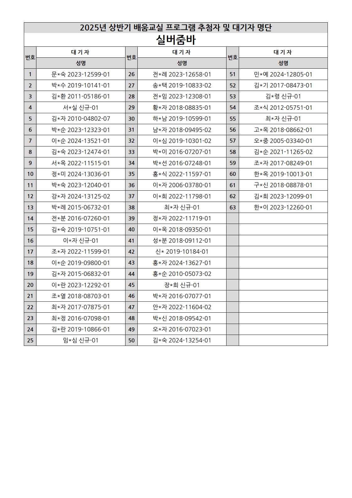 부천시소사노인복지관 2025년 상반기 배움교실 & 1분기 디지털정보화교실 추첨자 및 대기자 명단