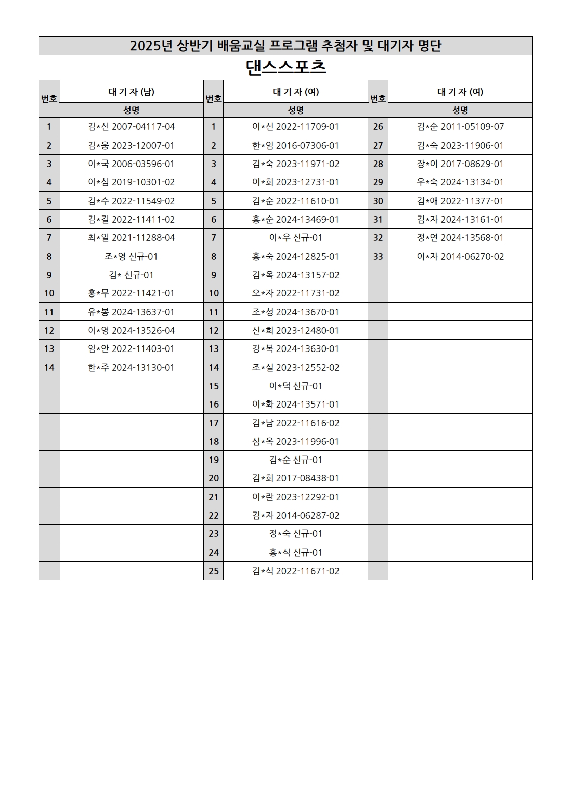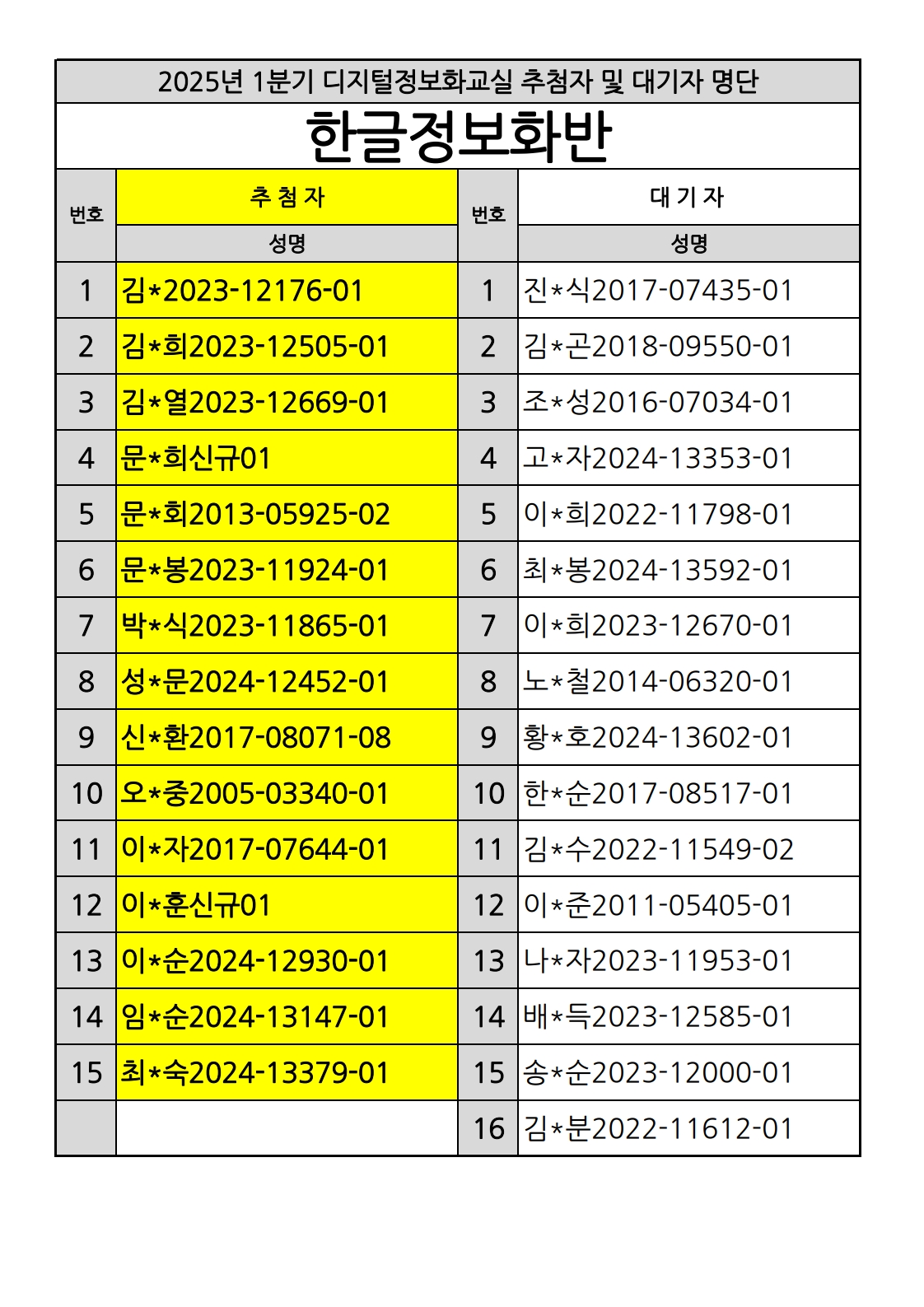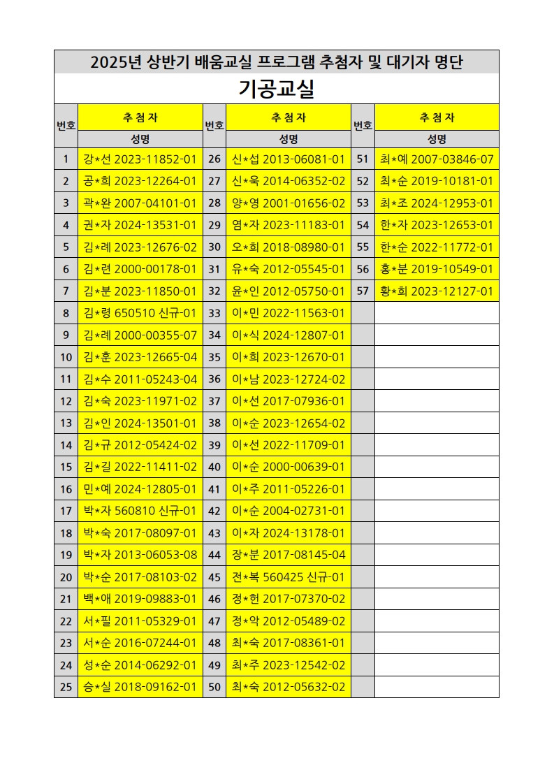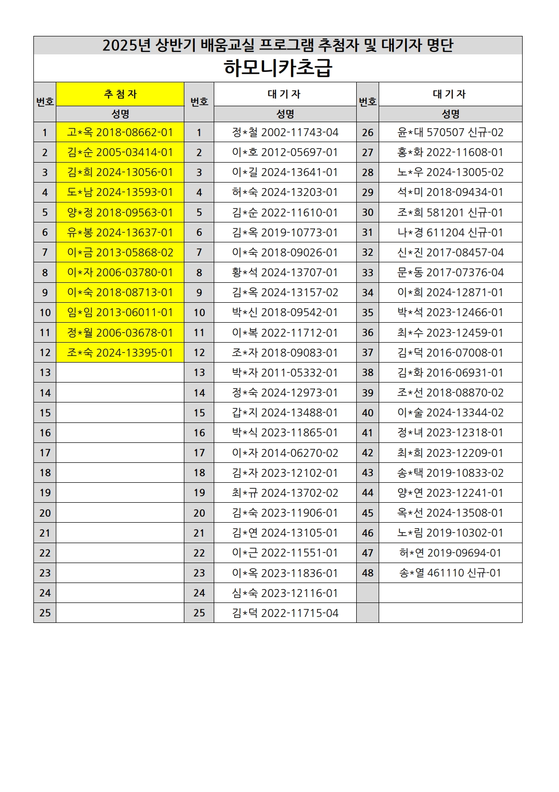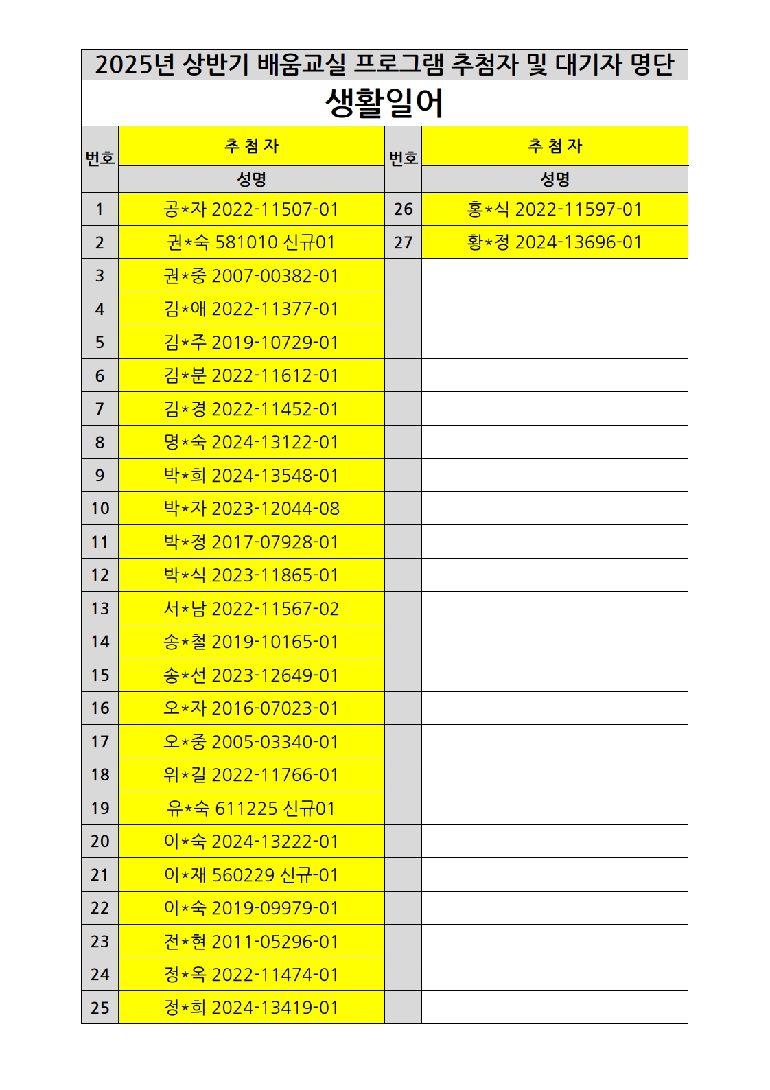 부천시소사노인복지관 2025년 상반기 배움교실 & 1분기 디지털정보화교실 추첨자 및 대기자 명단