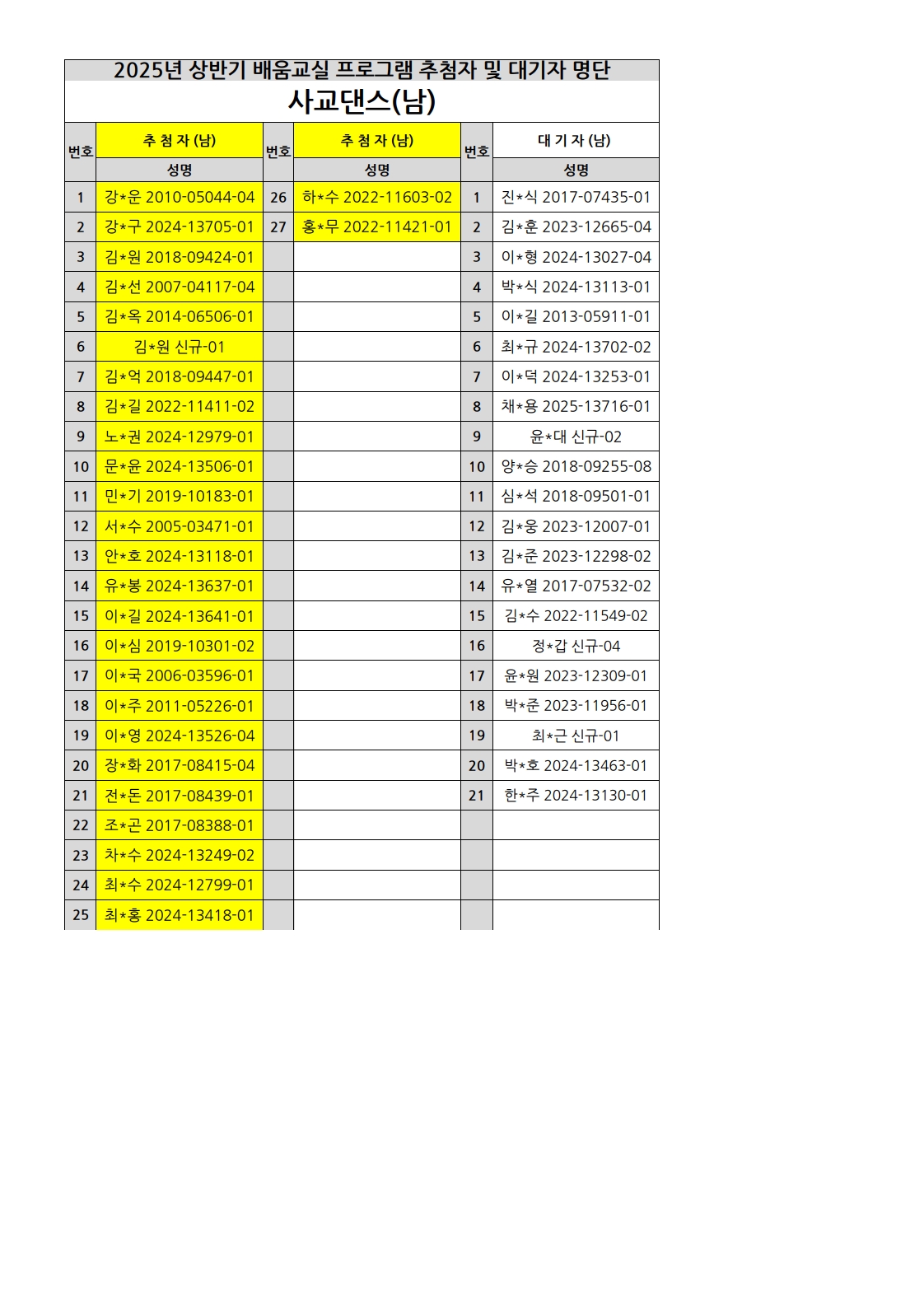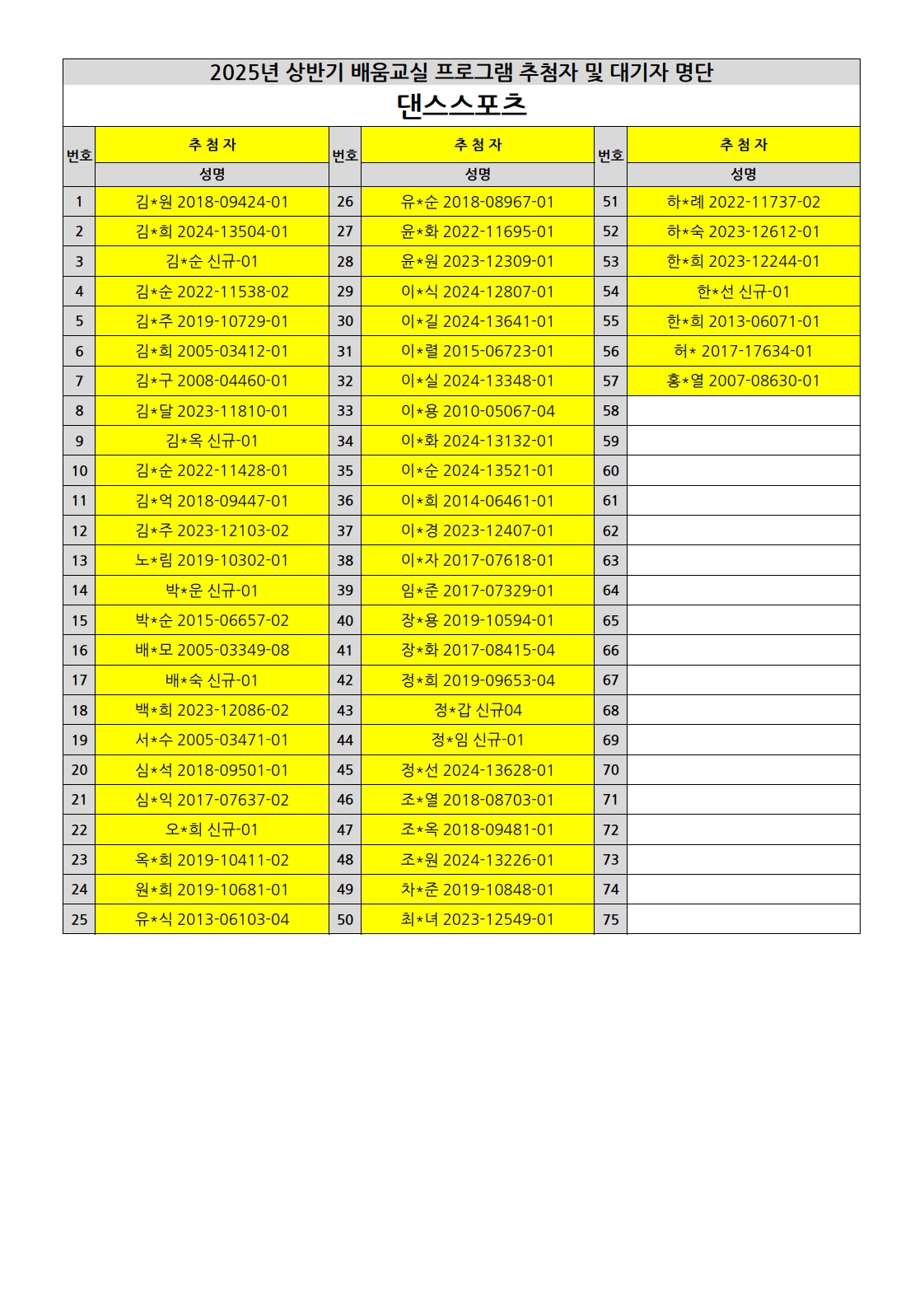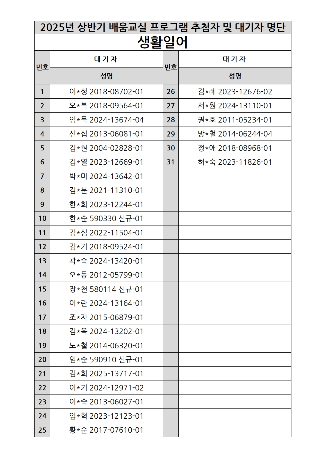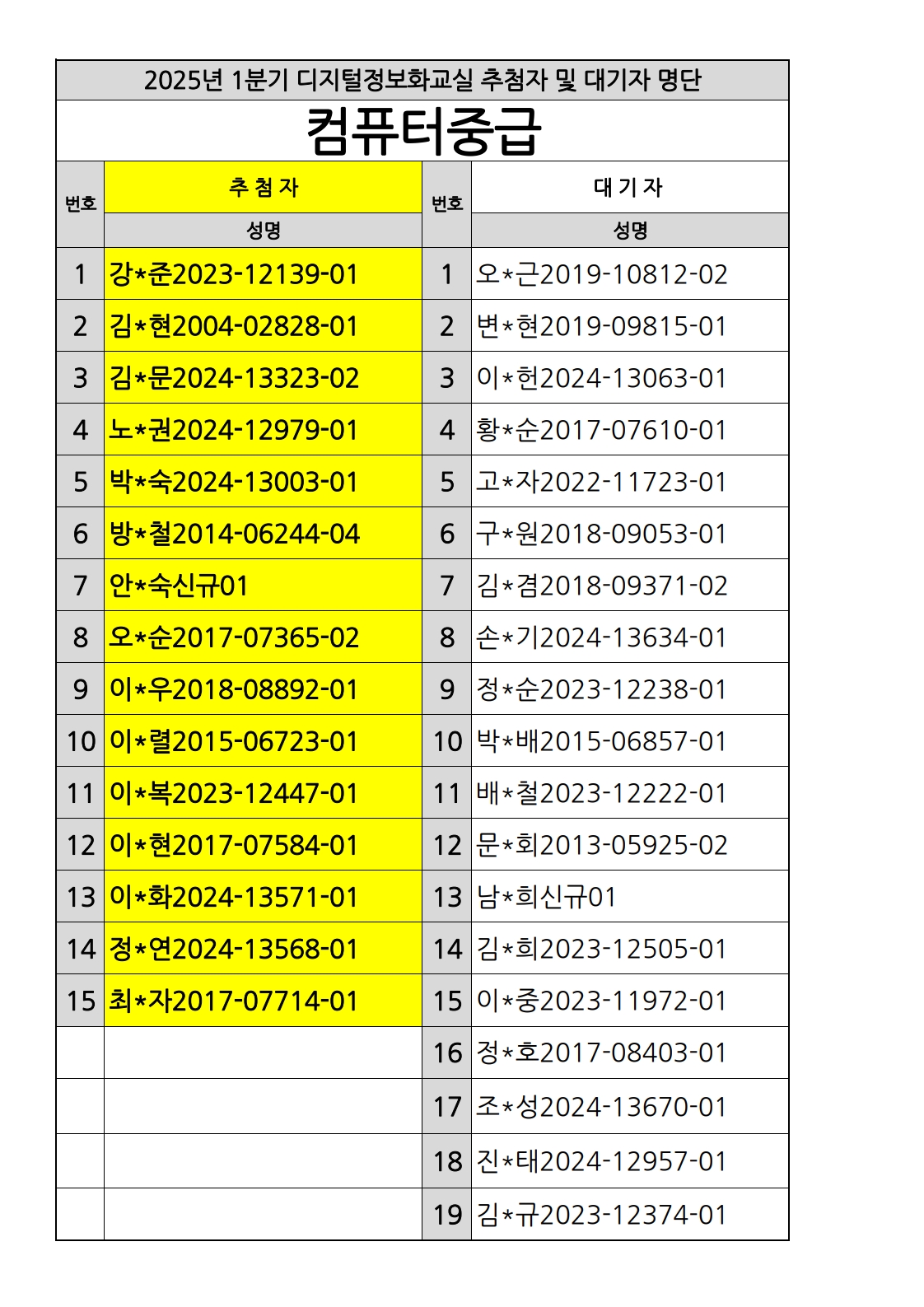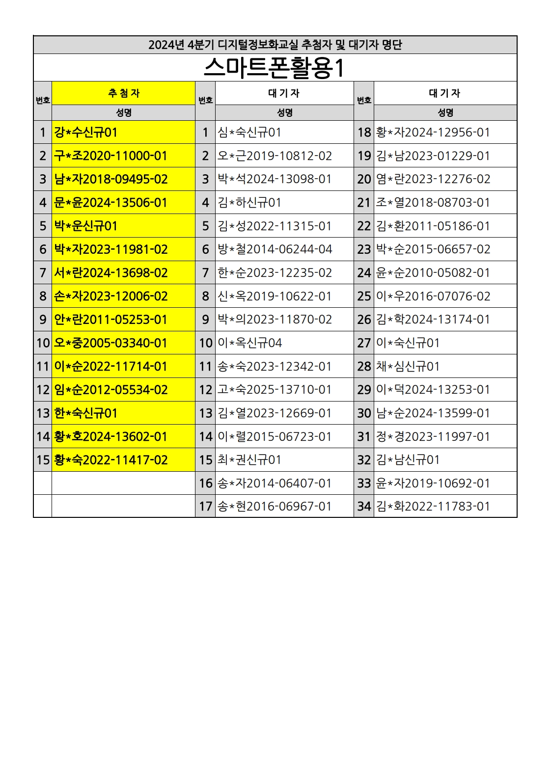 부천시소사노인복지관 2025년 상반기 배움교실 & 1분기 디지털정보화교실 추첨자 및 대기자 명단