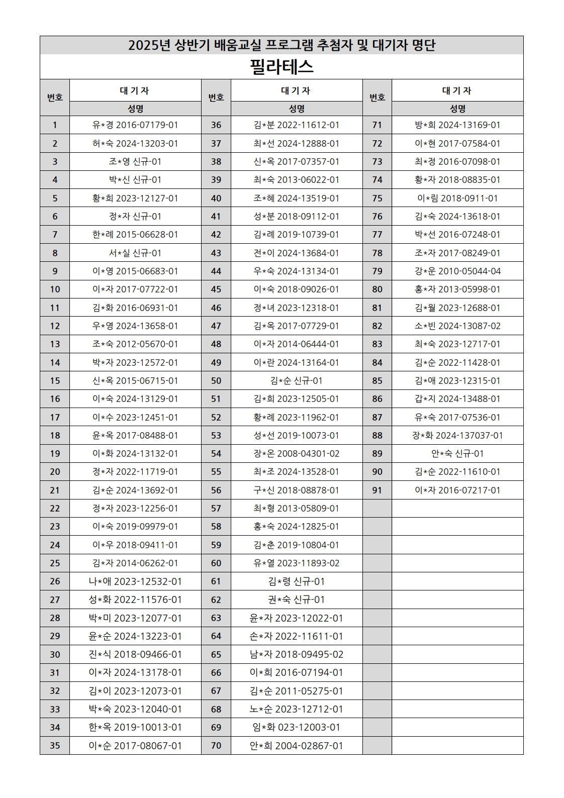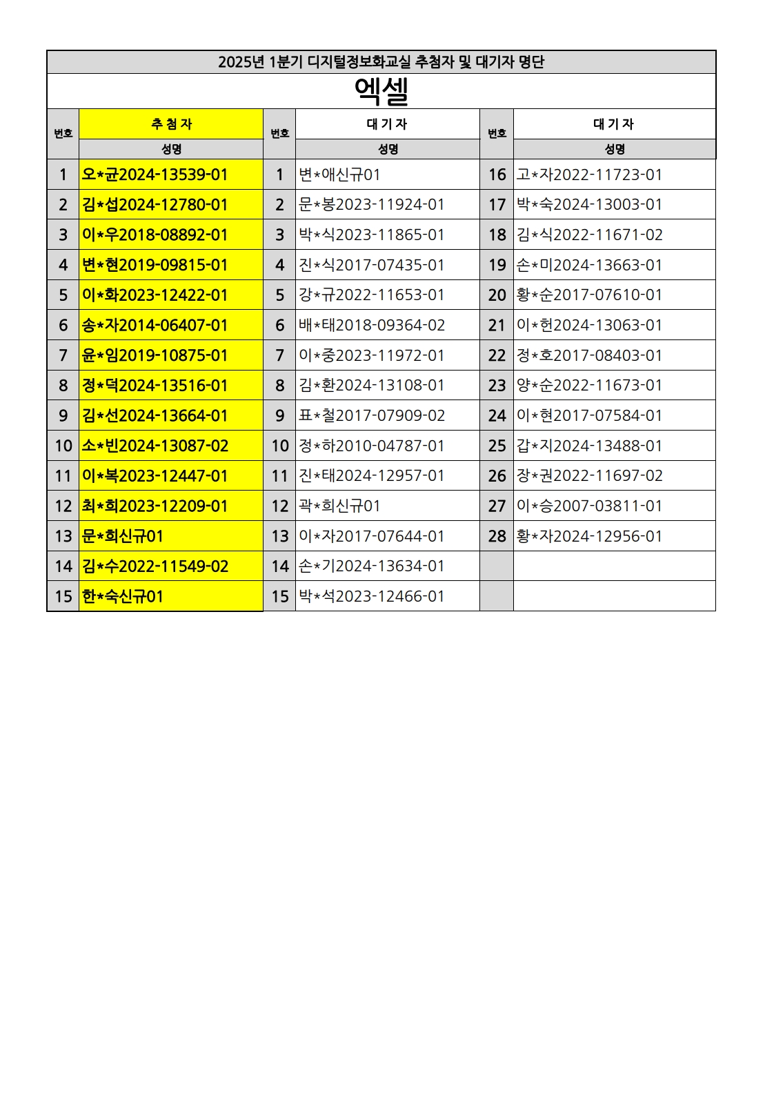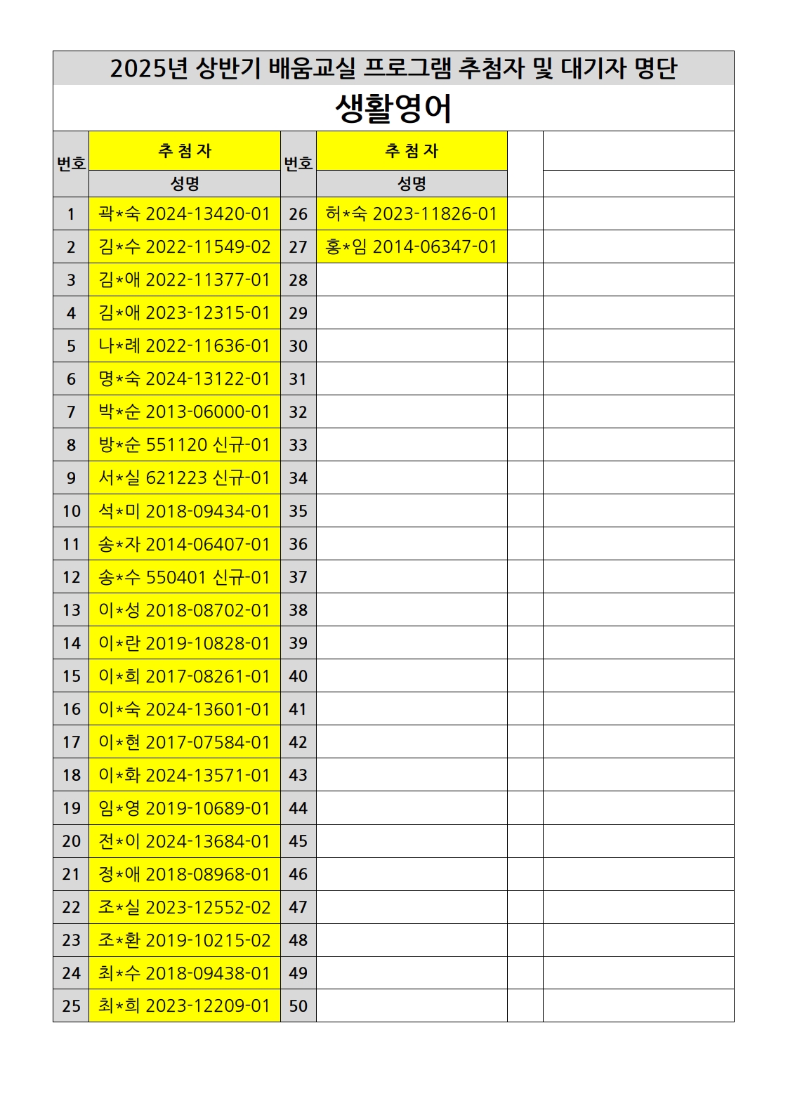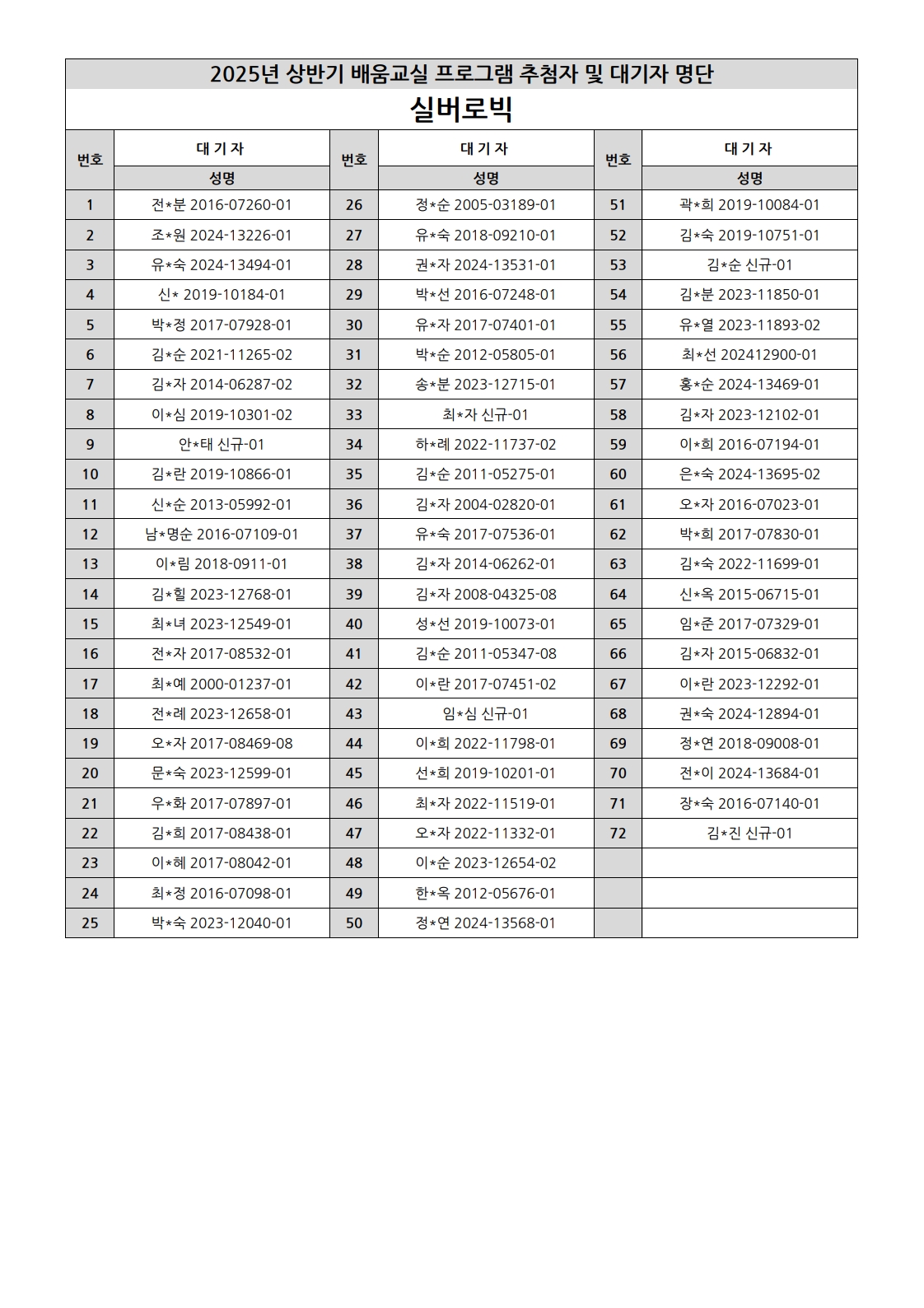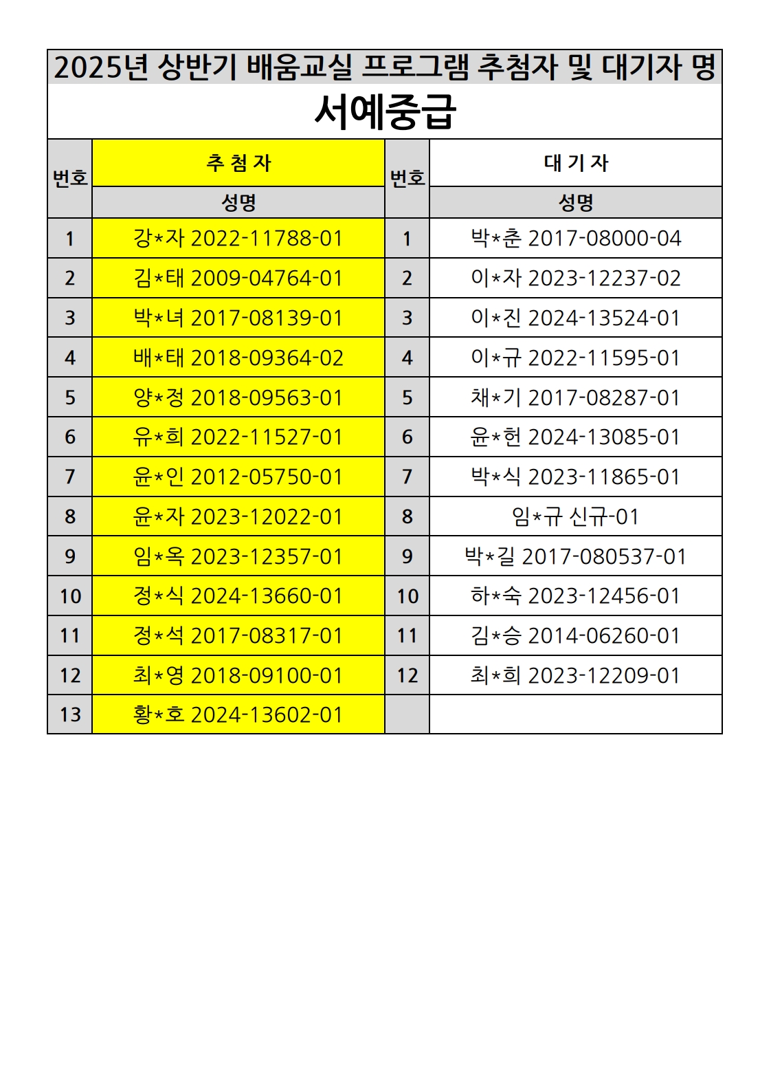 부천시소사노인복지관 2025년 상반기 배움교실 & 1분기 디지털정보화교실 추첨자 및 대기자 명단