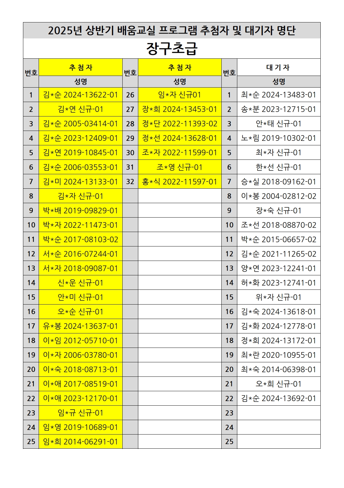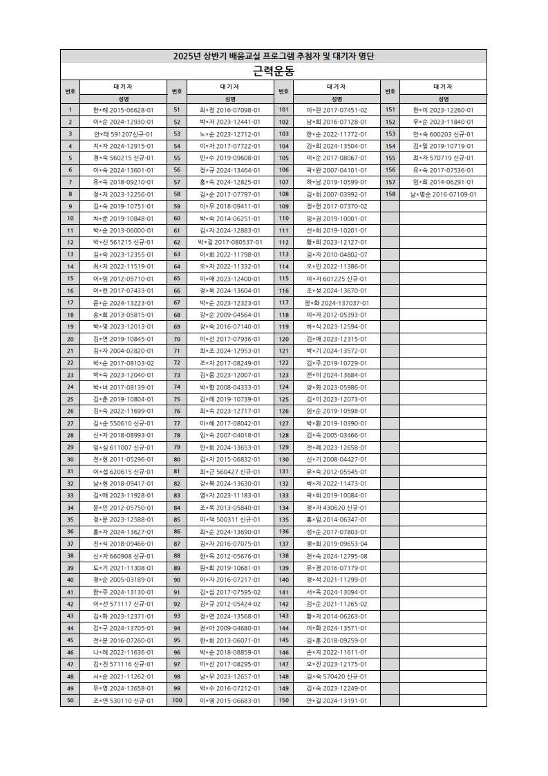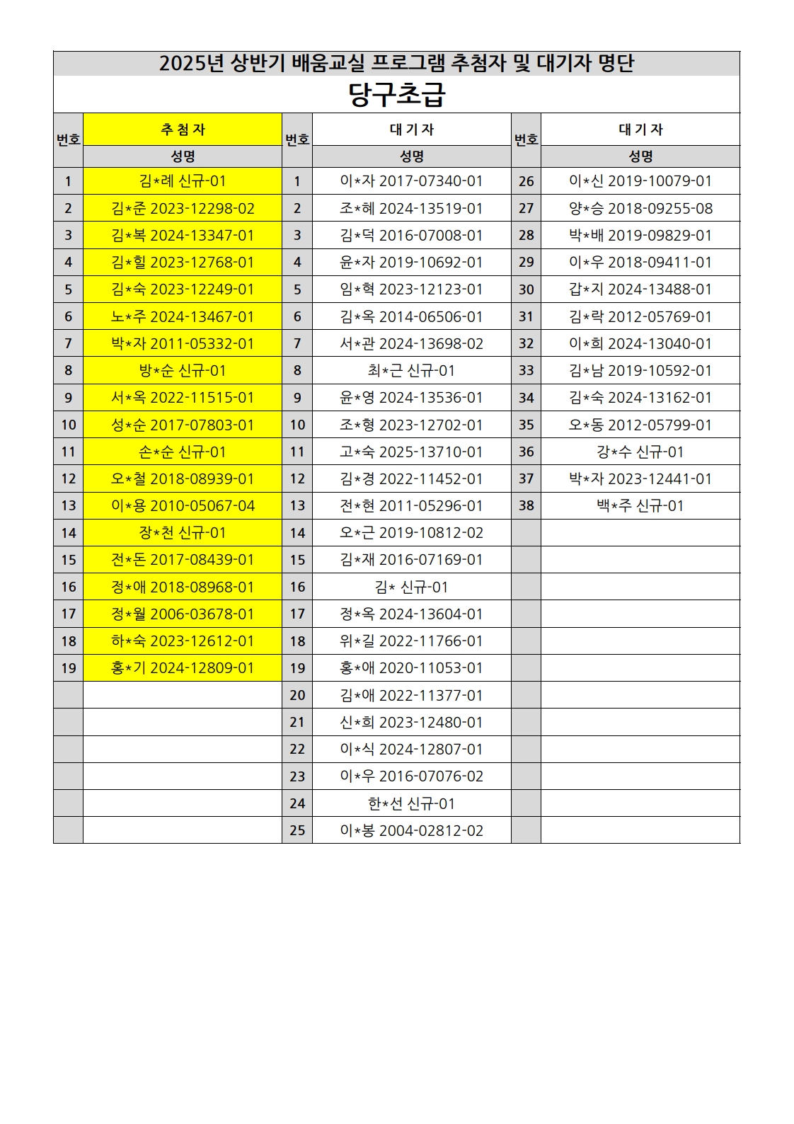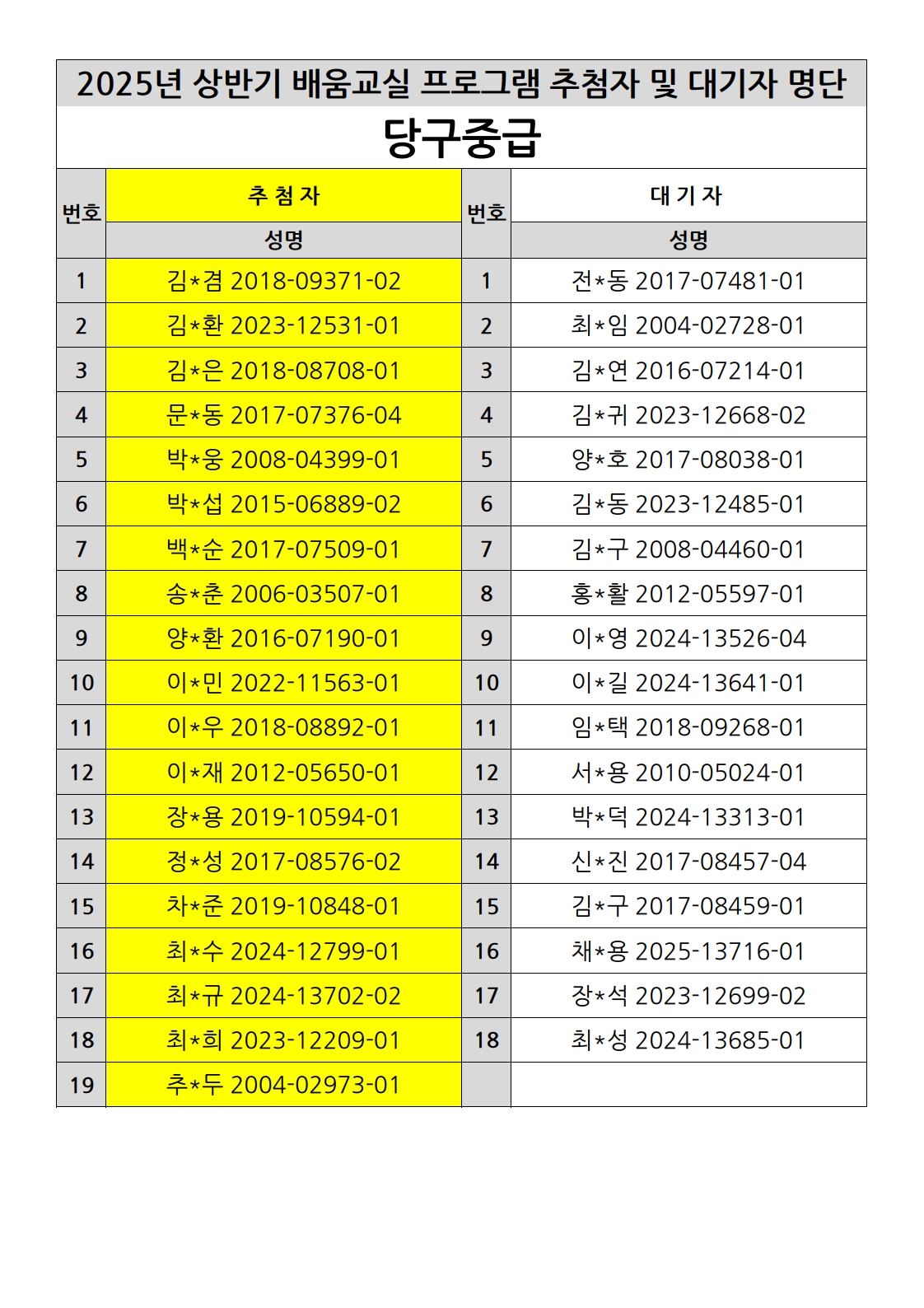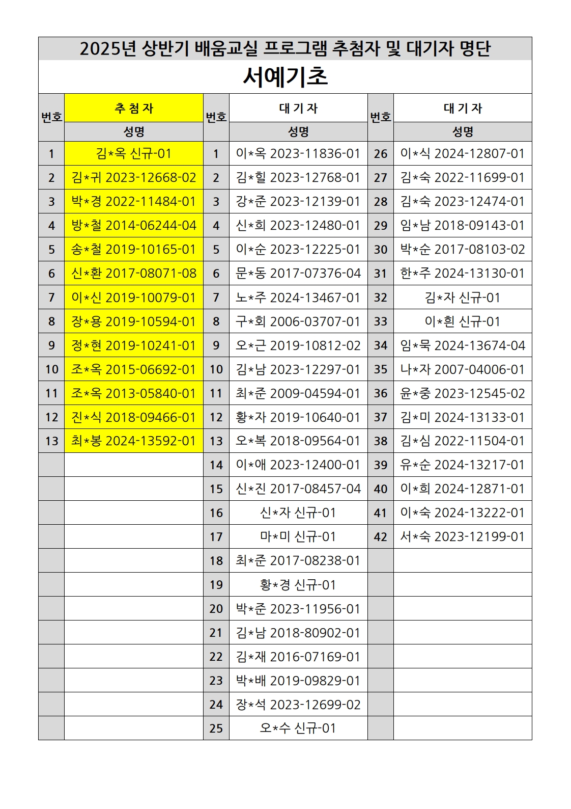 부천시소사노인복지관 2025년 상반기 배움교실 & 1분기 디지털정보화교실 추첨자 및 대기자 명단