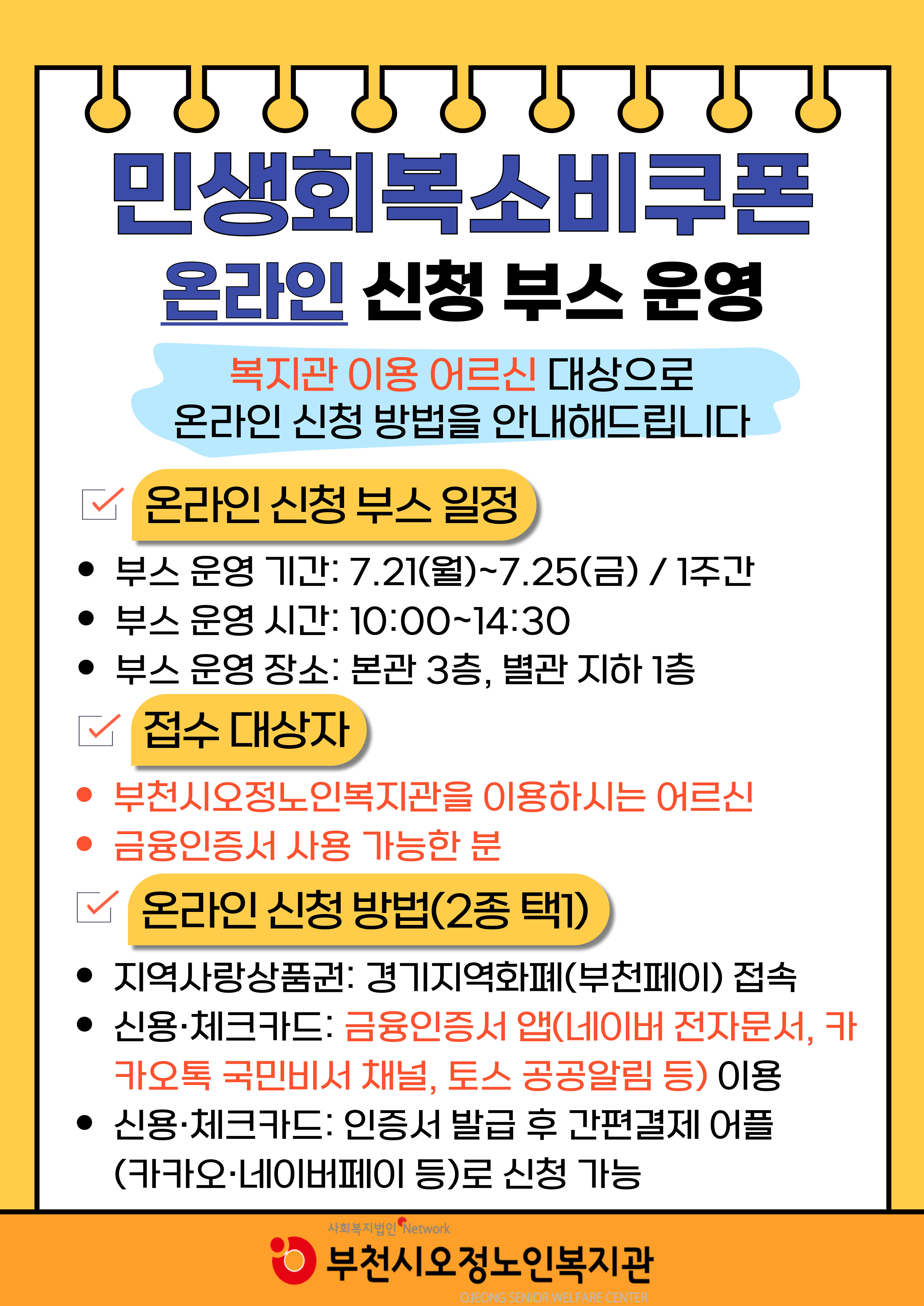 부천시오정노인복지관에서는 어르신 대상으로 민생회복 소비쿠폰 온라인 신청 부스를 운영합니다.