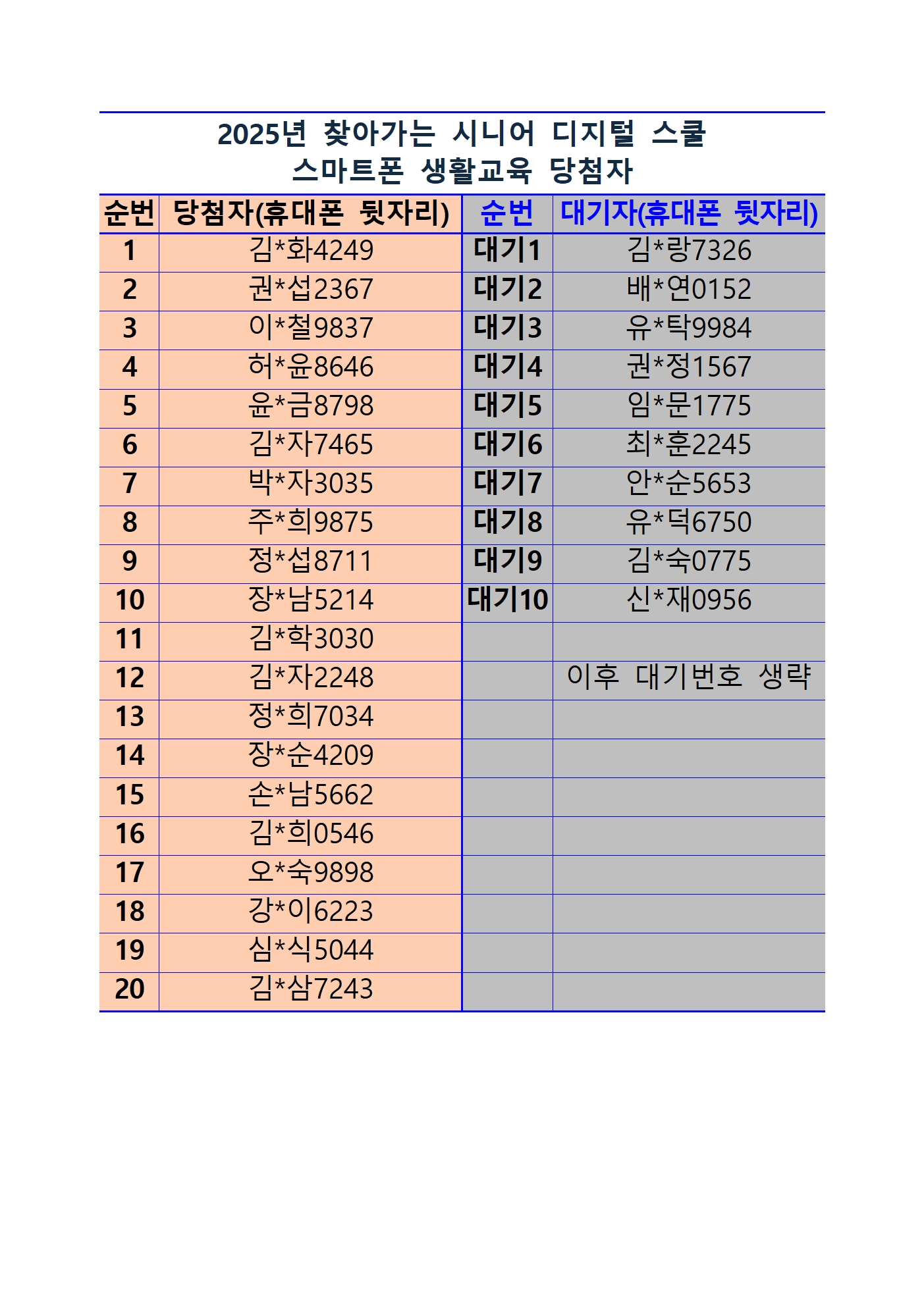 2025년 찾아가는 시니어 디지털 스쿨(스마트폰 생활교육) 당첨자 공지
