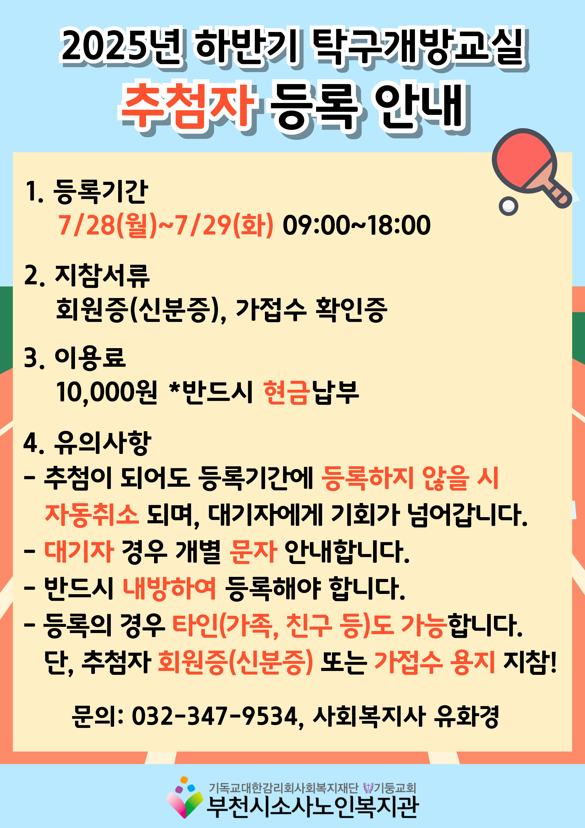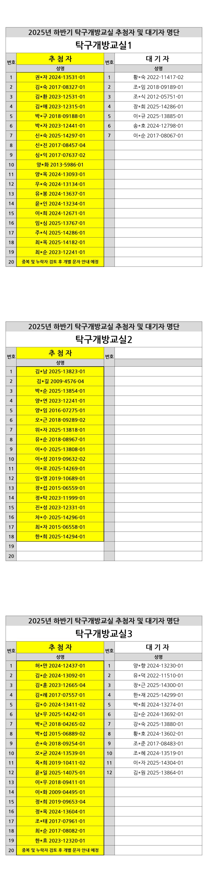 [노년사회화교육사업] 2025년 하반기 탁구개방교실 추첨자 및 대기자 명단 공개