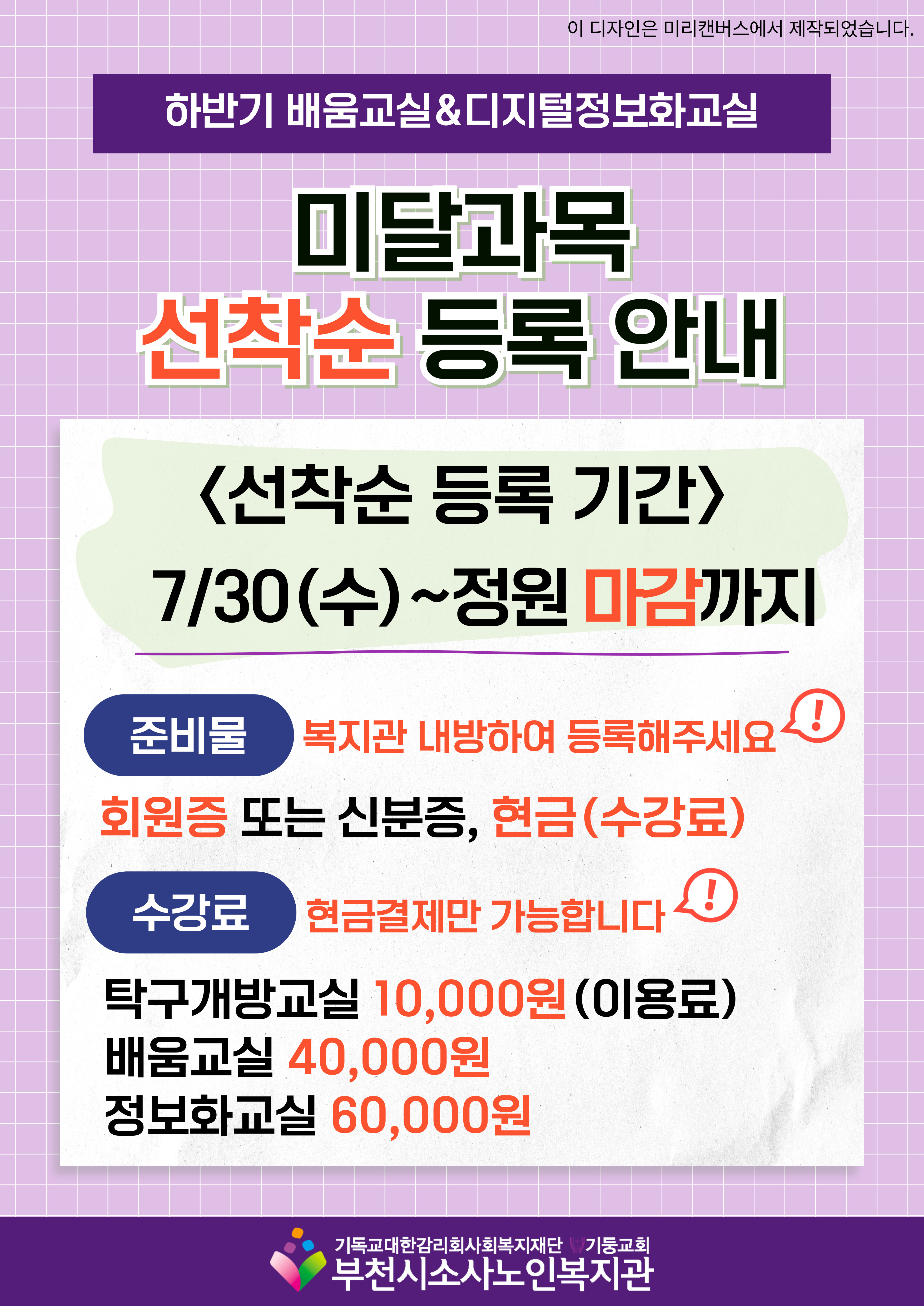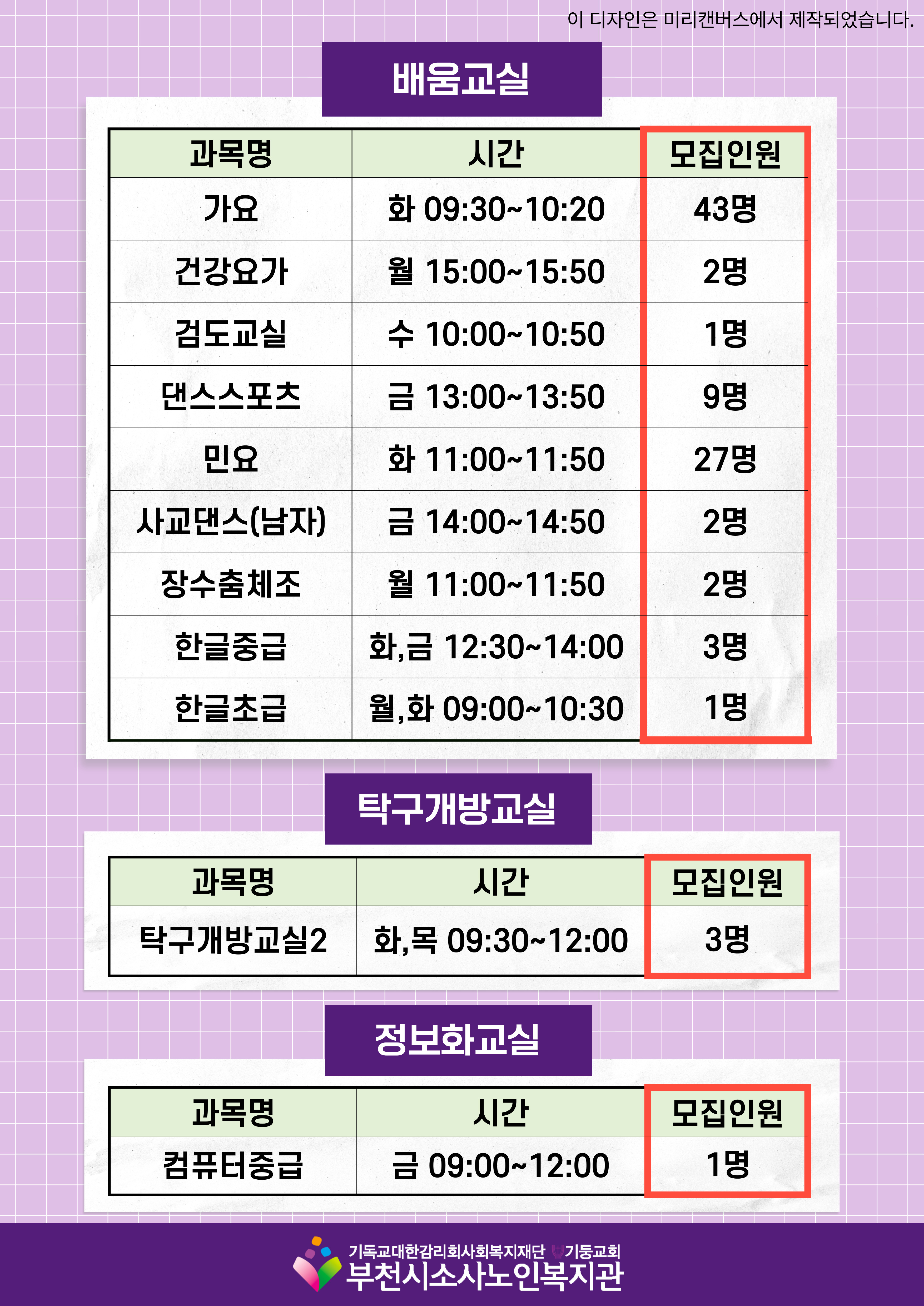<추가>2025년 하반기 배움교실&3분기 정보화교실 미달과목 선착순 등록 안내