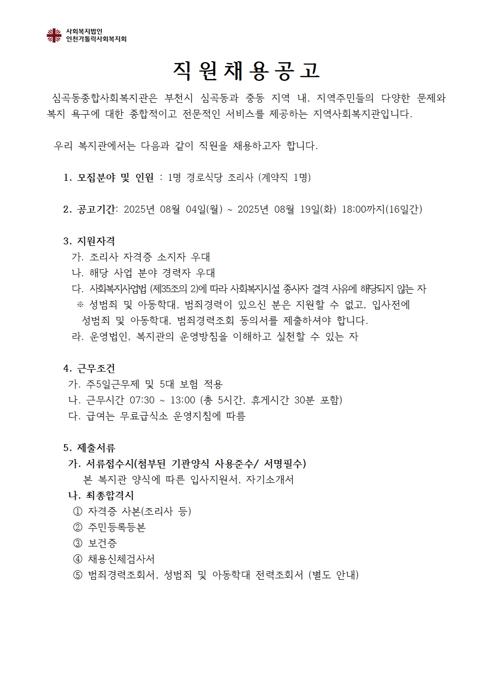 심곡동종합사회복지관 직원채용(무료급식소 취사원) 총1명