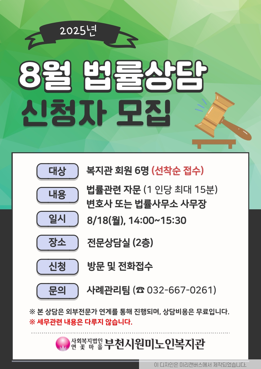 원미노인복지관 8월 무료 법률상담 신청 안내