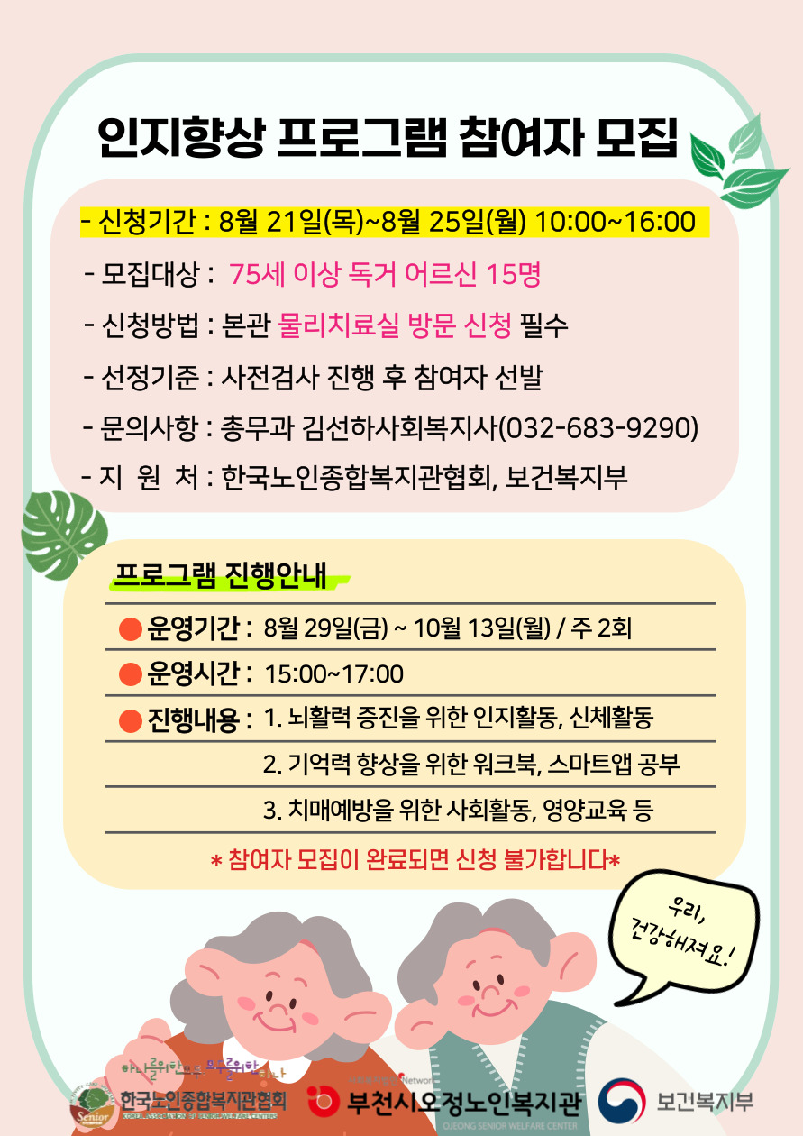 인지향상프로그램 '인지+' 참여자 모집 안내