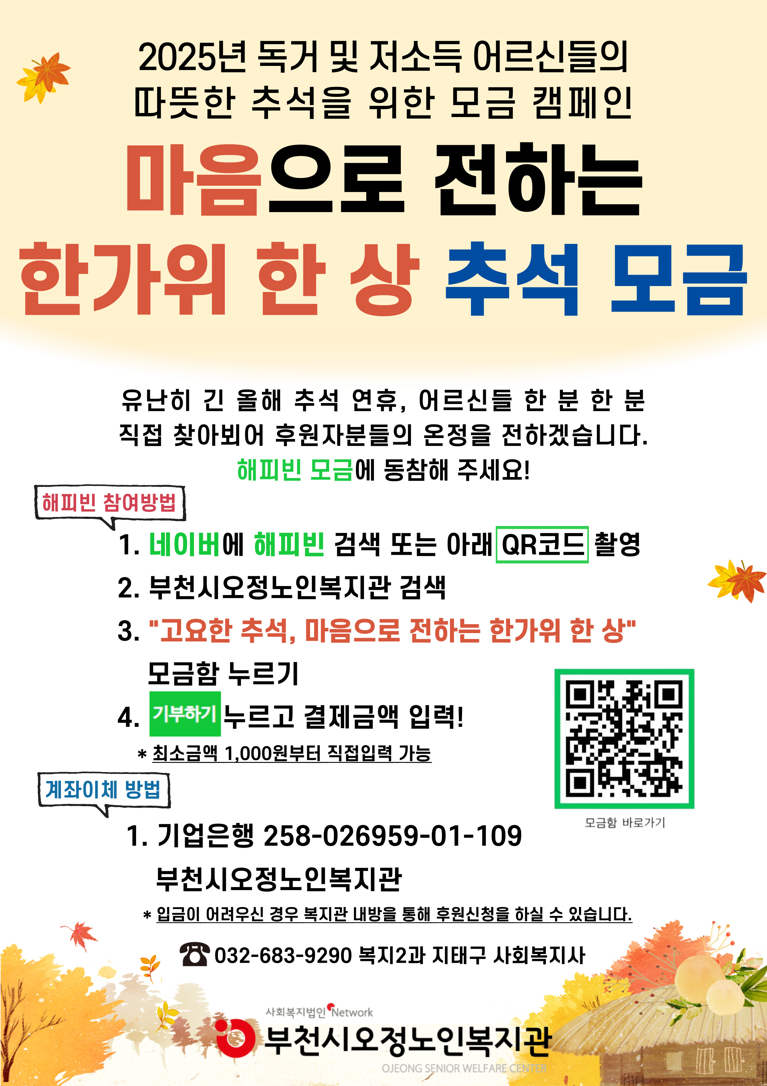 재가복지사업에서는 2025년 추석을 맞이하여 해피빈 모금함을 개설하였습니다.