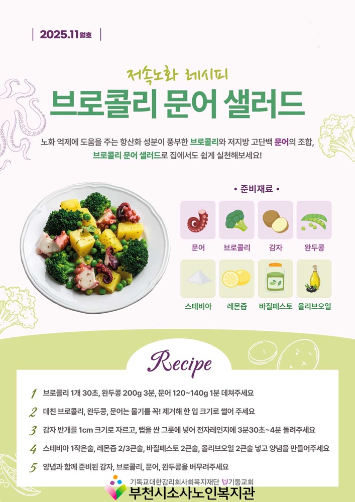 11월의 영양쏙속정보는 저속노화 음식인 '브로콜리 문어 샐러드'를 소개합니다.